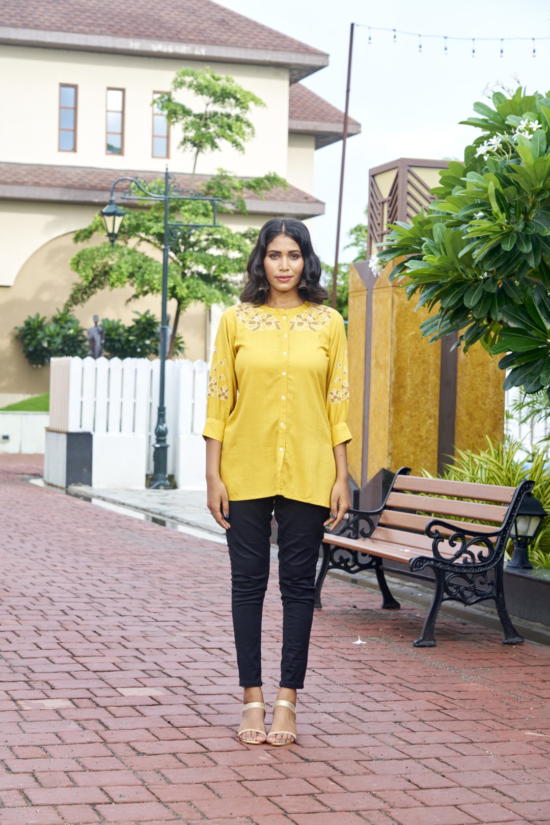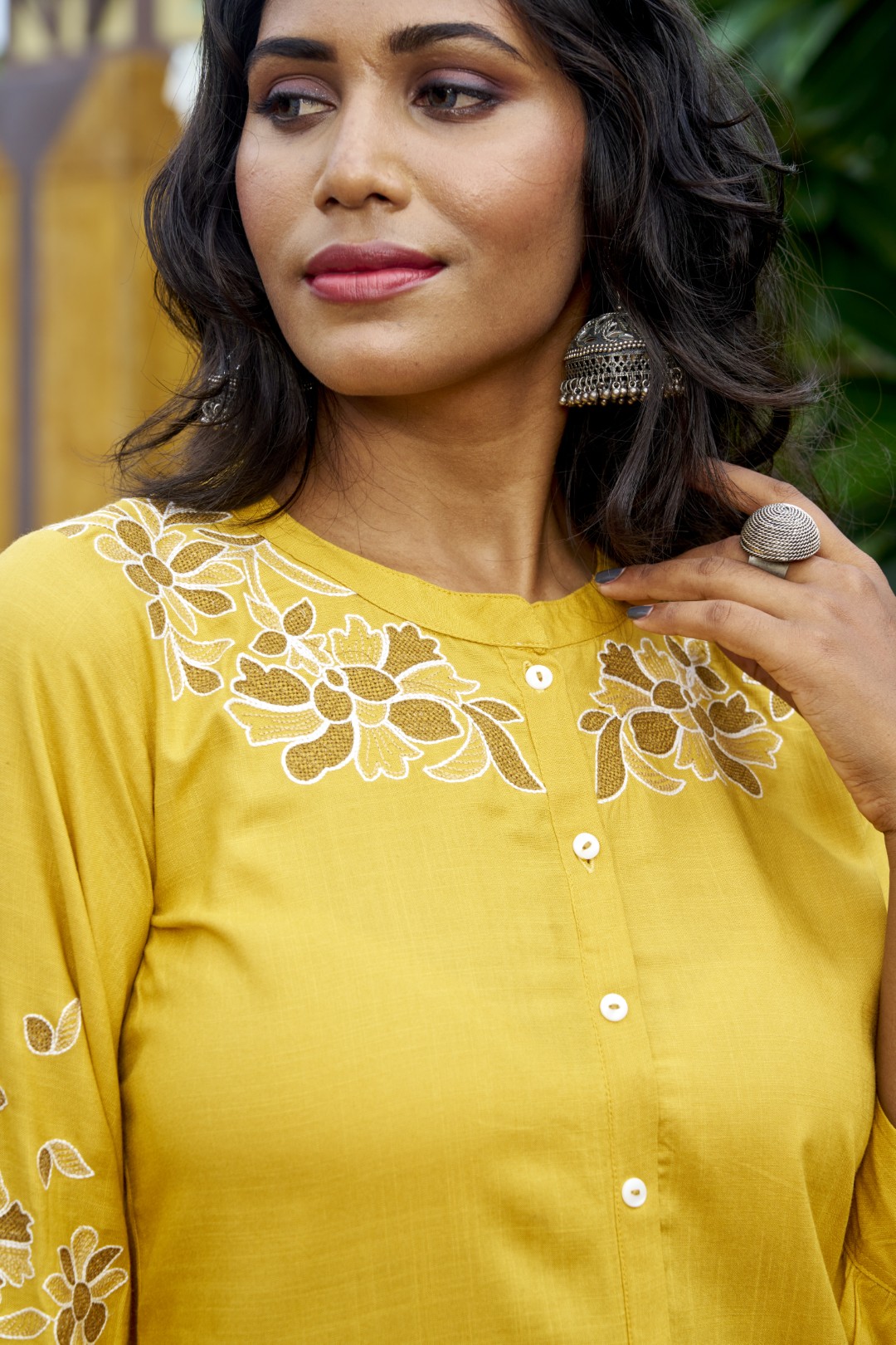 Yoke & Shoulder: Highlighted with white floral thread embroidery across the shoulders, giving a delicate yet bold touch.
