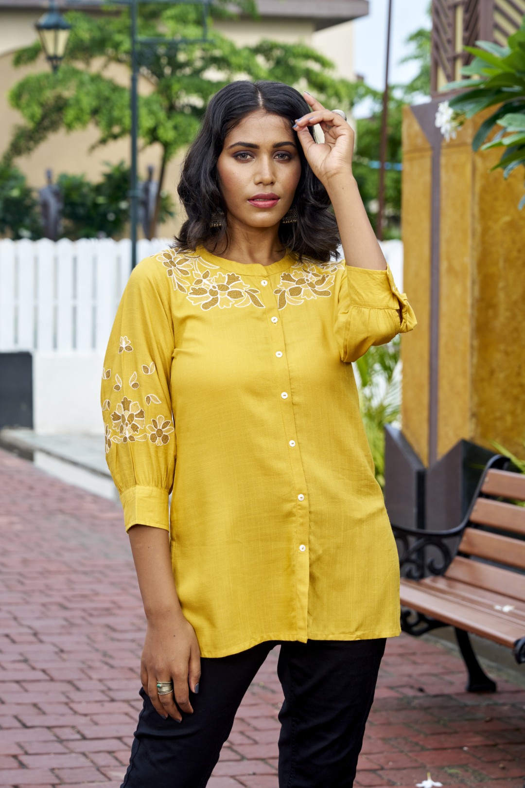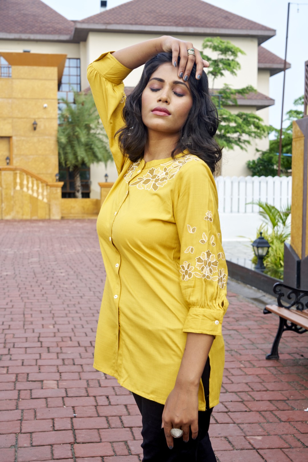 Sleeves: 3/4th sleeves with embroidered cutwork-style floral motifs scattered along the arms for a breezy, feminine look.