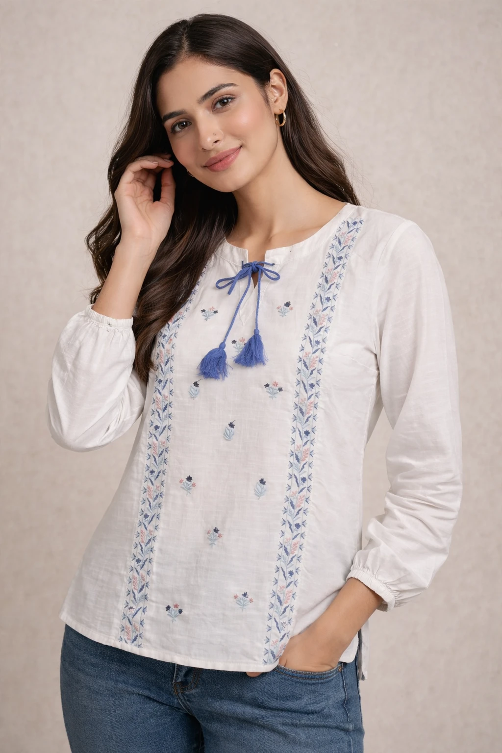 Design: Elegant white tunic-style top featuring vertical floral embroidery panels and scattered micro-floral motifs.