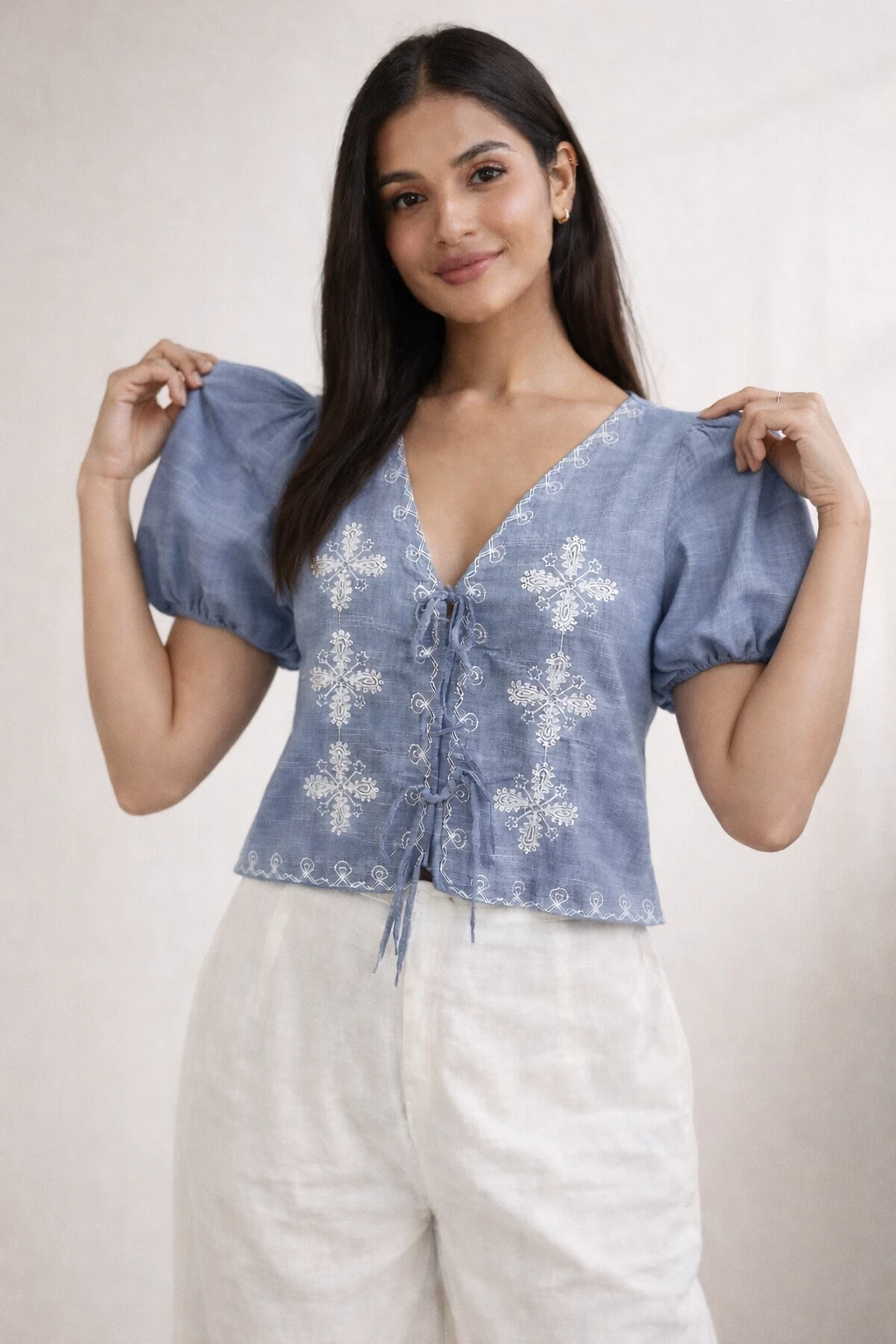 Detailing: Intricate white floral embroidery on a soft blue textured fabric.