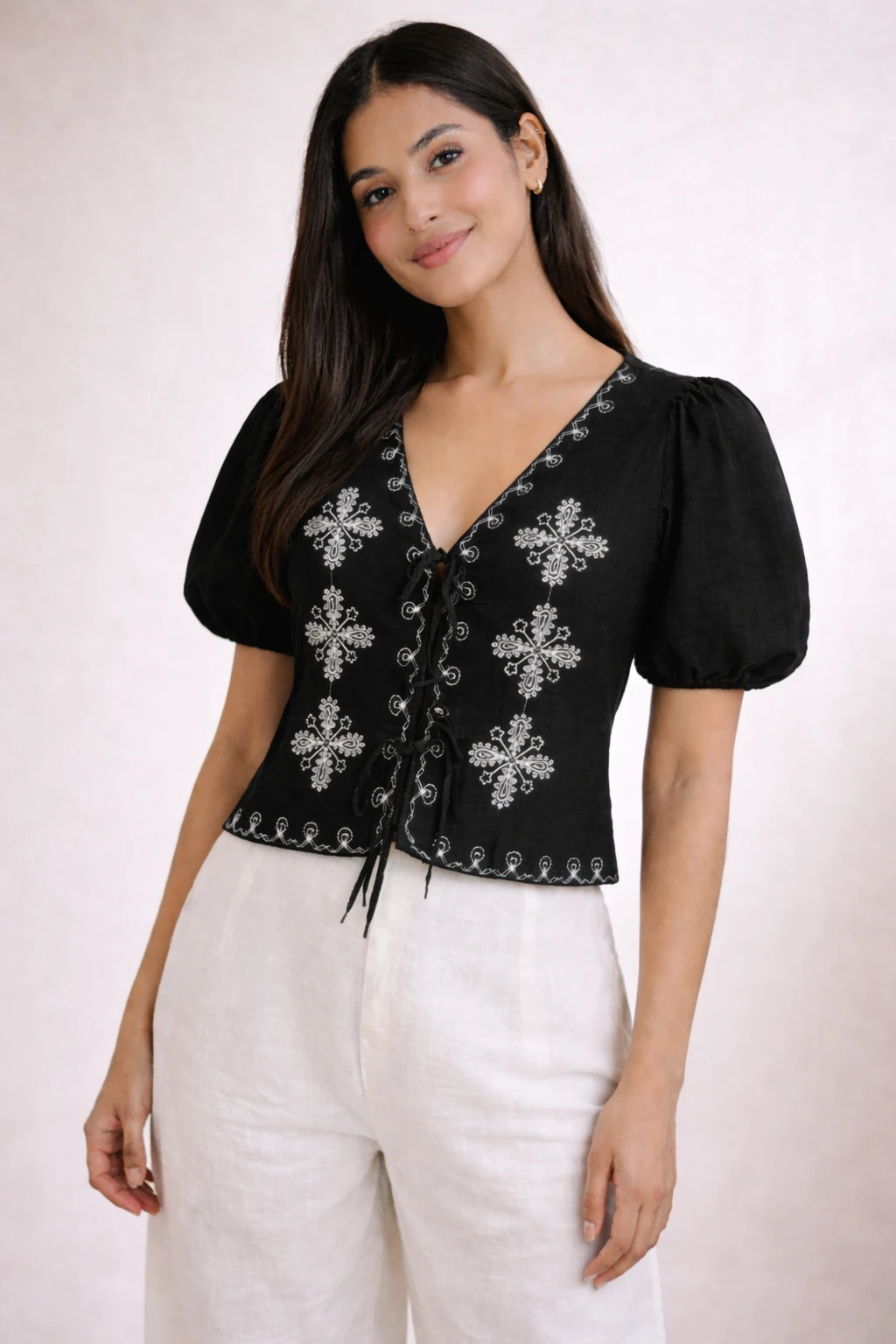Sleeves: Trendy puff sleeves with elasticated cuffs for a voluminous look.
