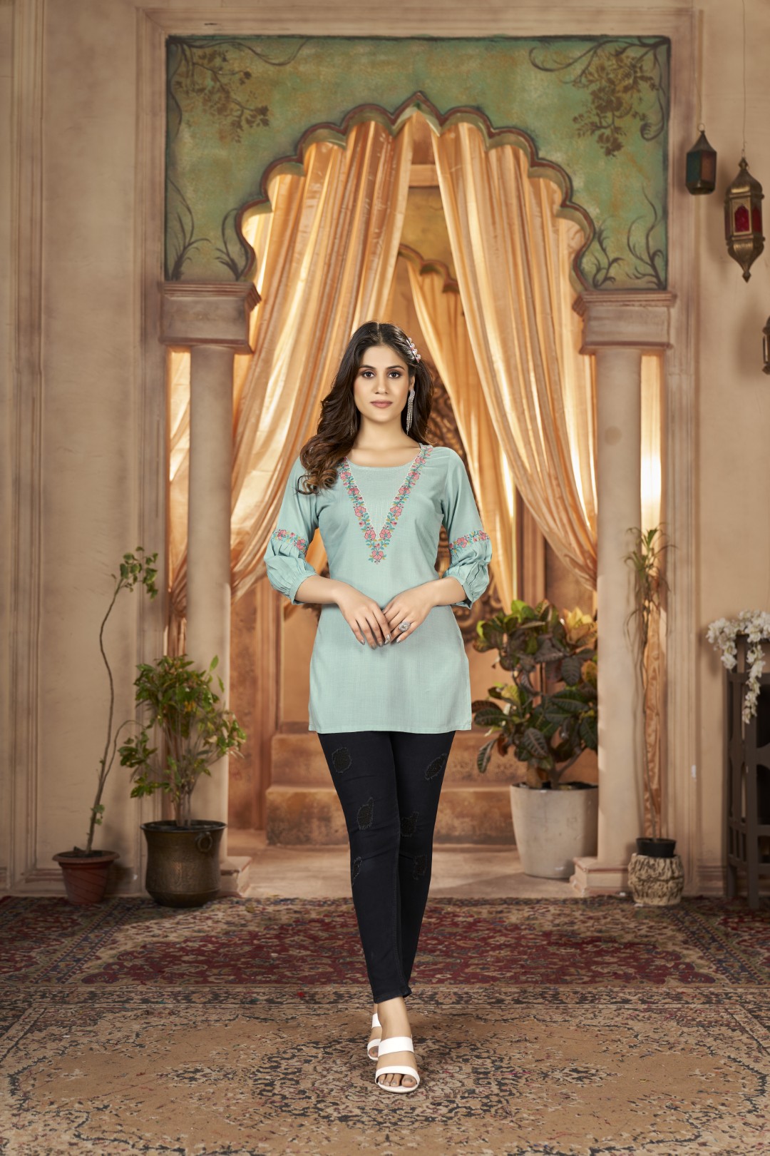 Sleeves: 3/4th sleeves with gathered pleats near the elbow and finished with a matching embroidered floral band.