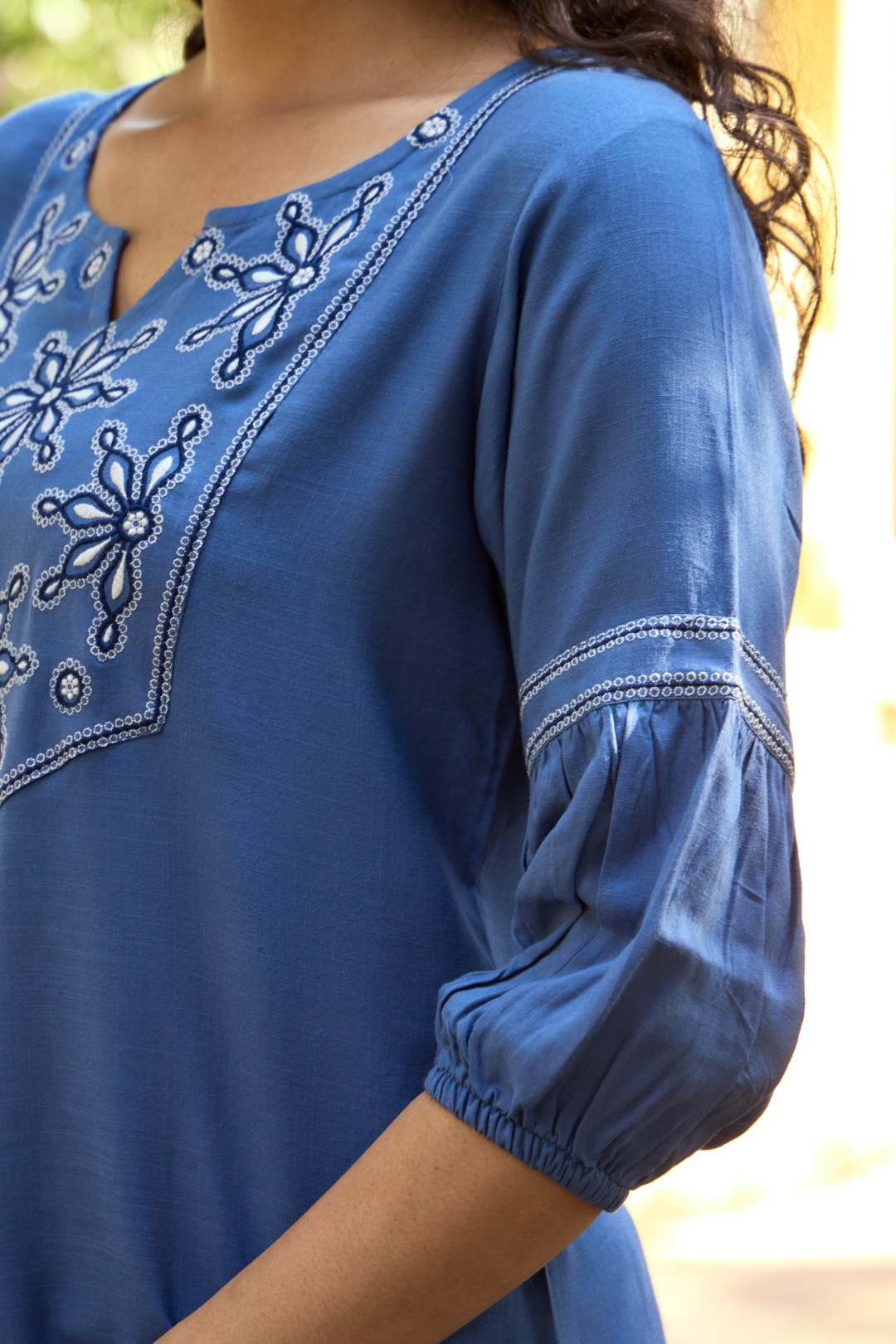 Neckline: Round neck with a slight V-cut slit, outlined with thread detailing.