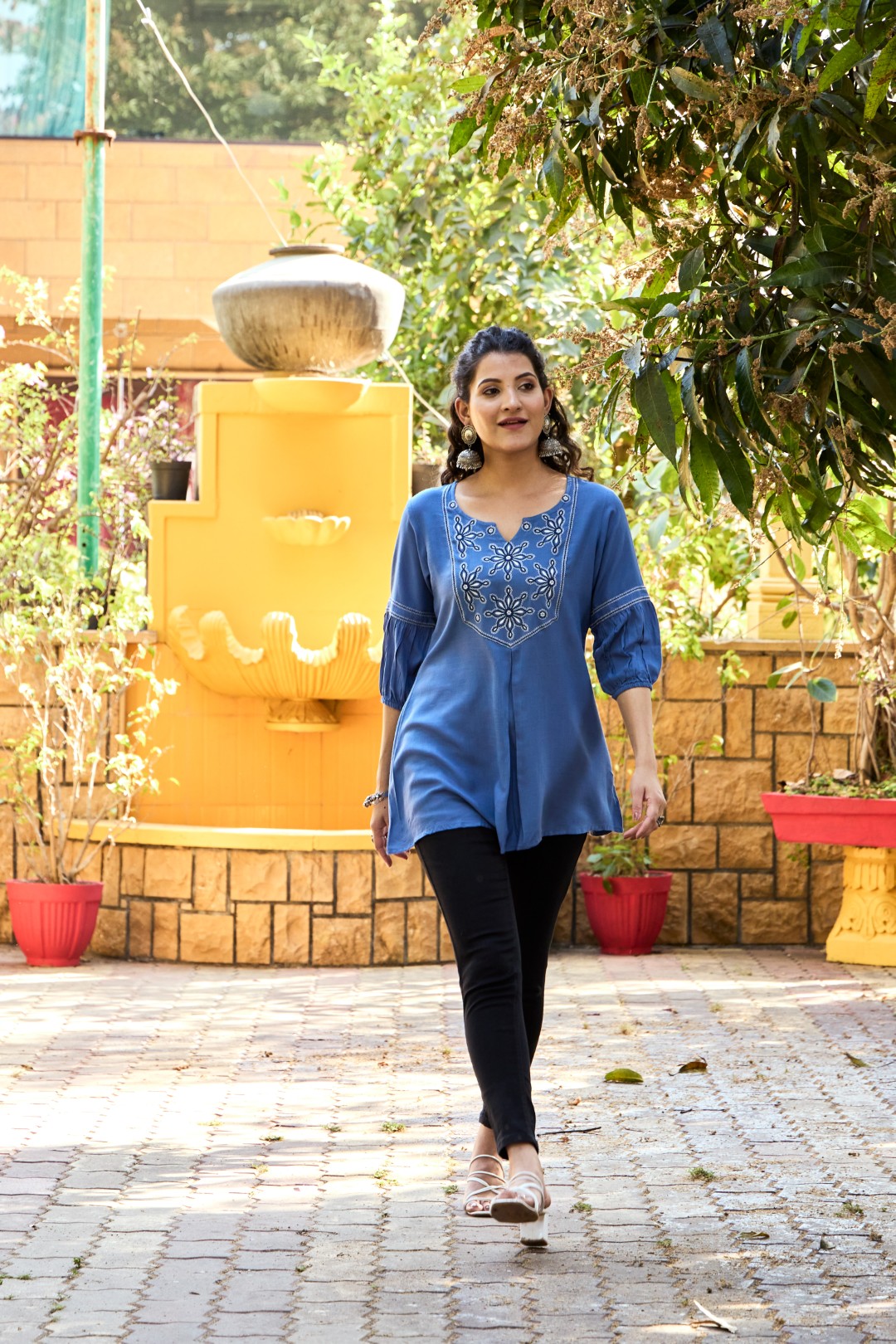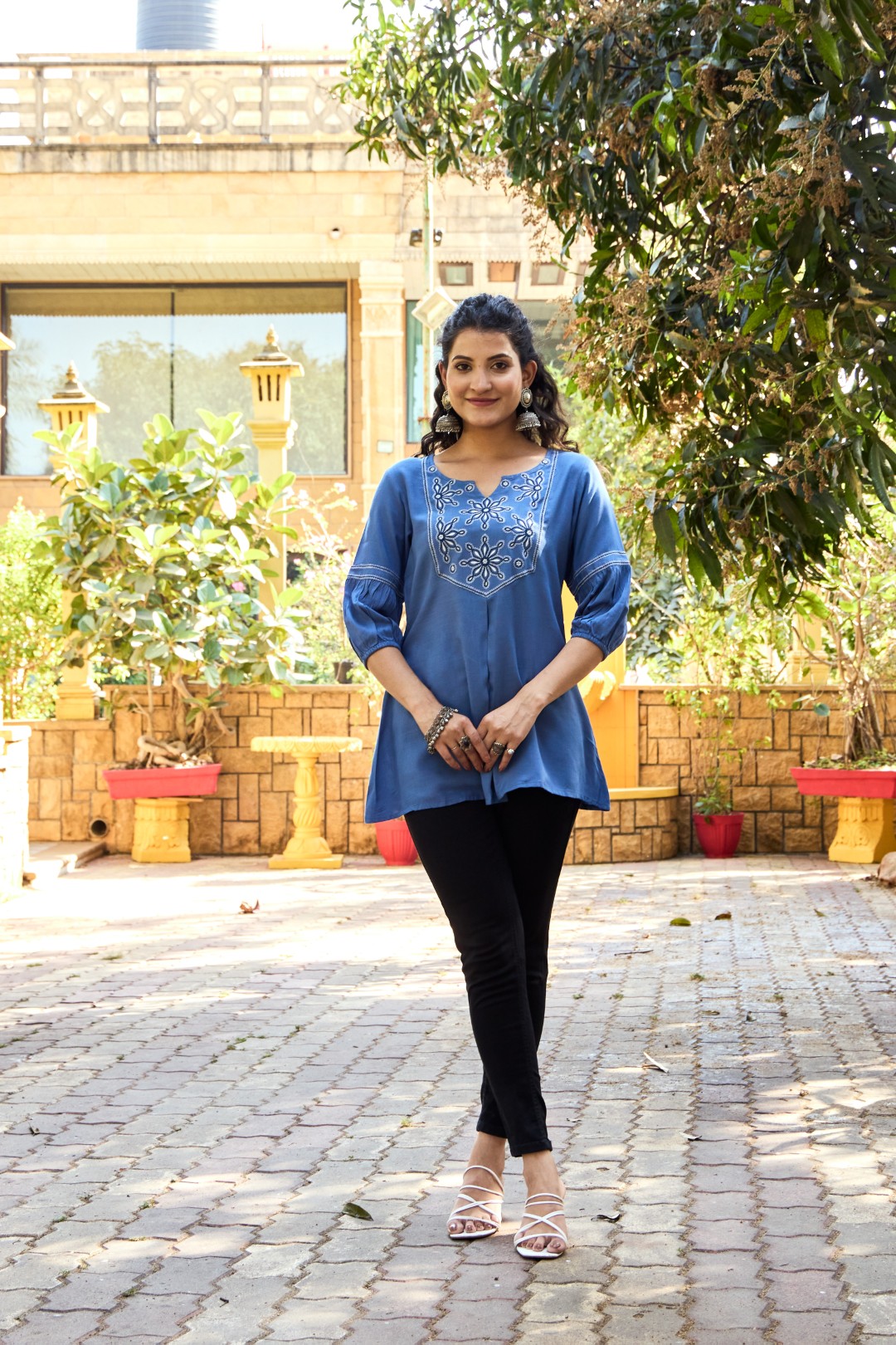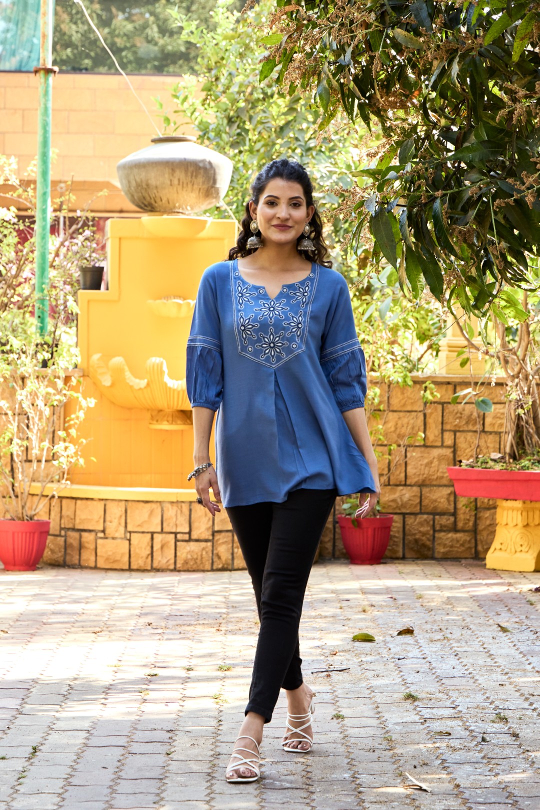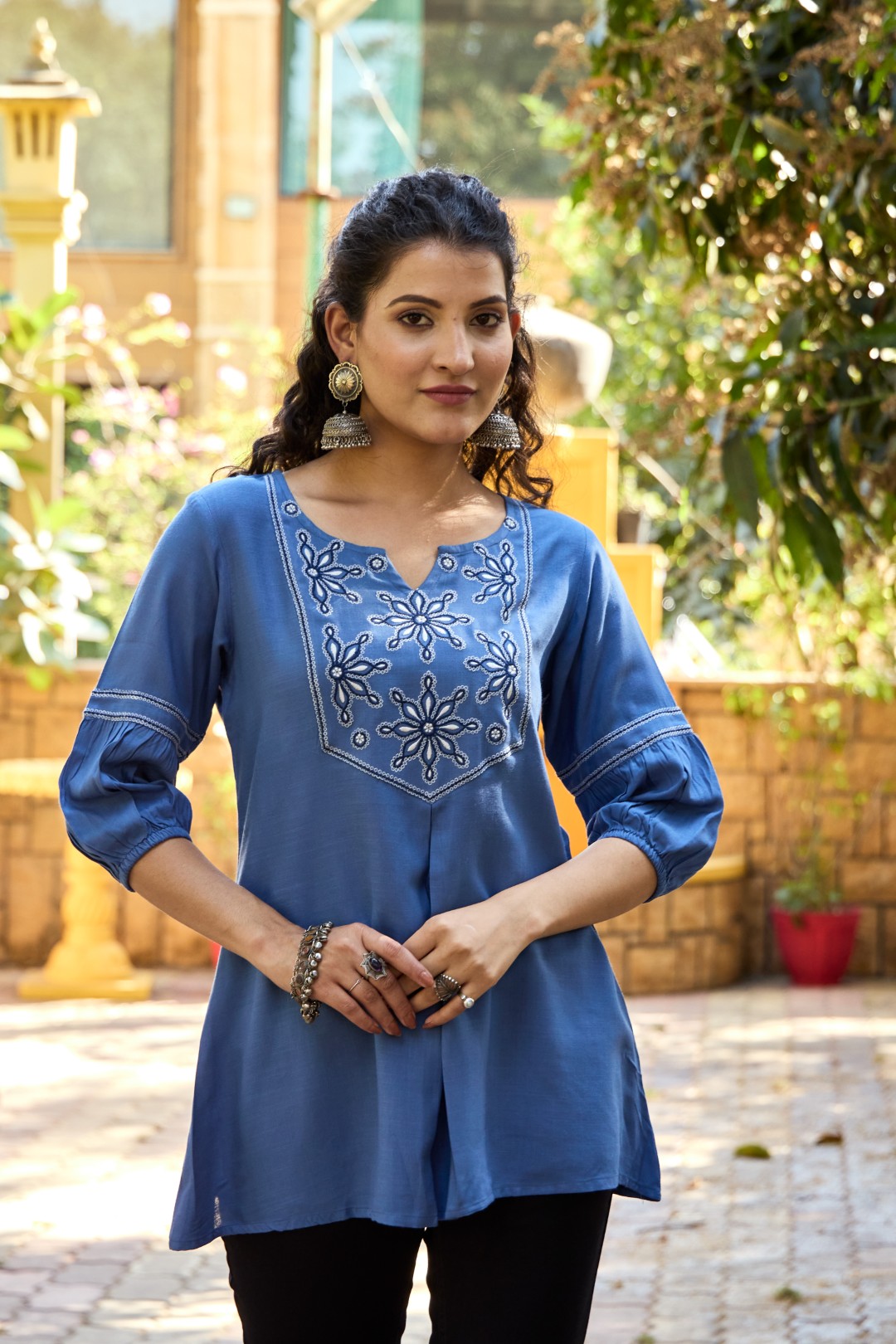 Sleeves: 3/4th length with gathered pleats near the elbow, finished with parallel thread lines for a stylish touch.