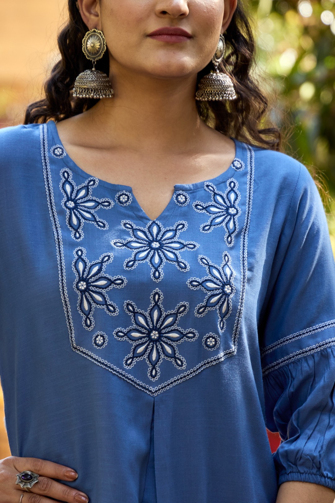 Yoke: Prominent geometric panel at the front with bold floral thread embroidery in white and navy blue, arranged symmetrically.
