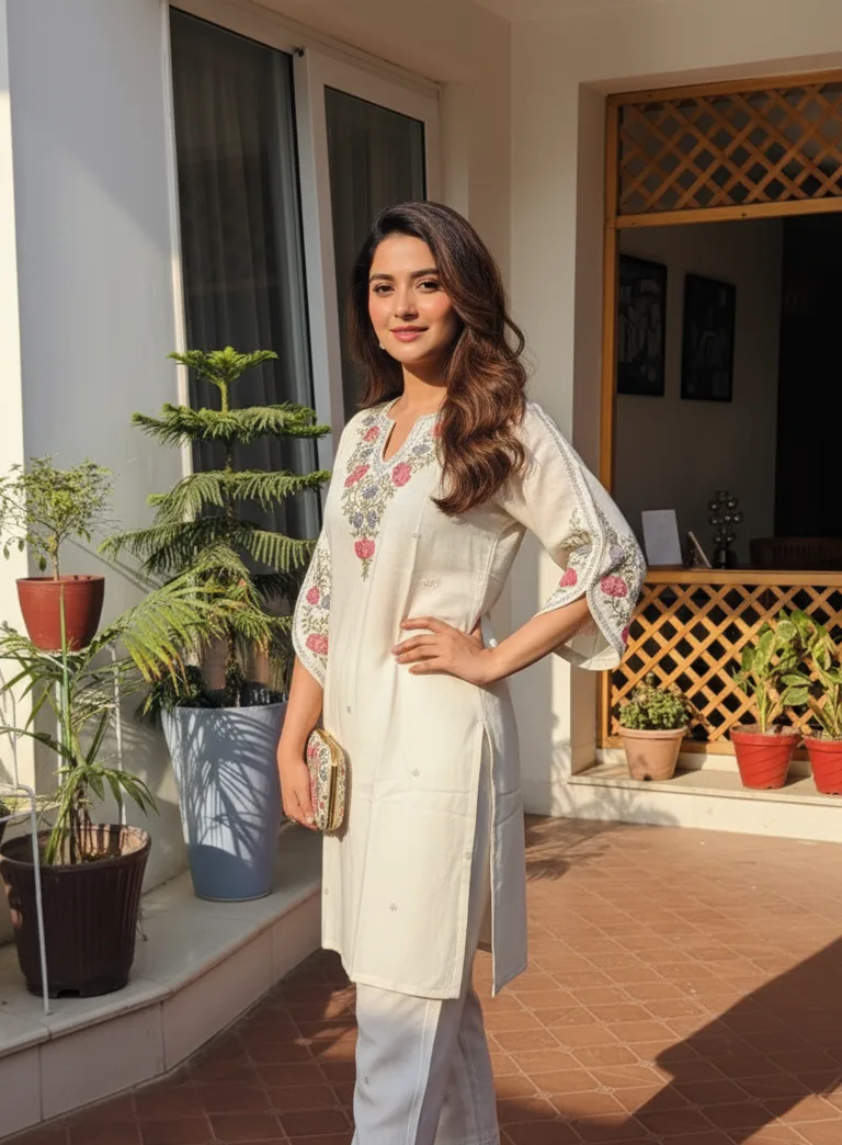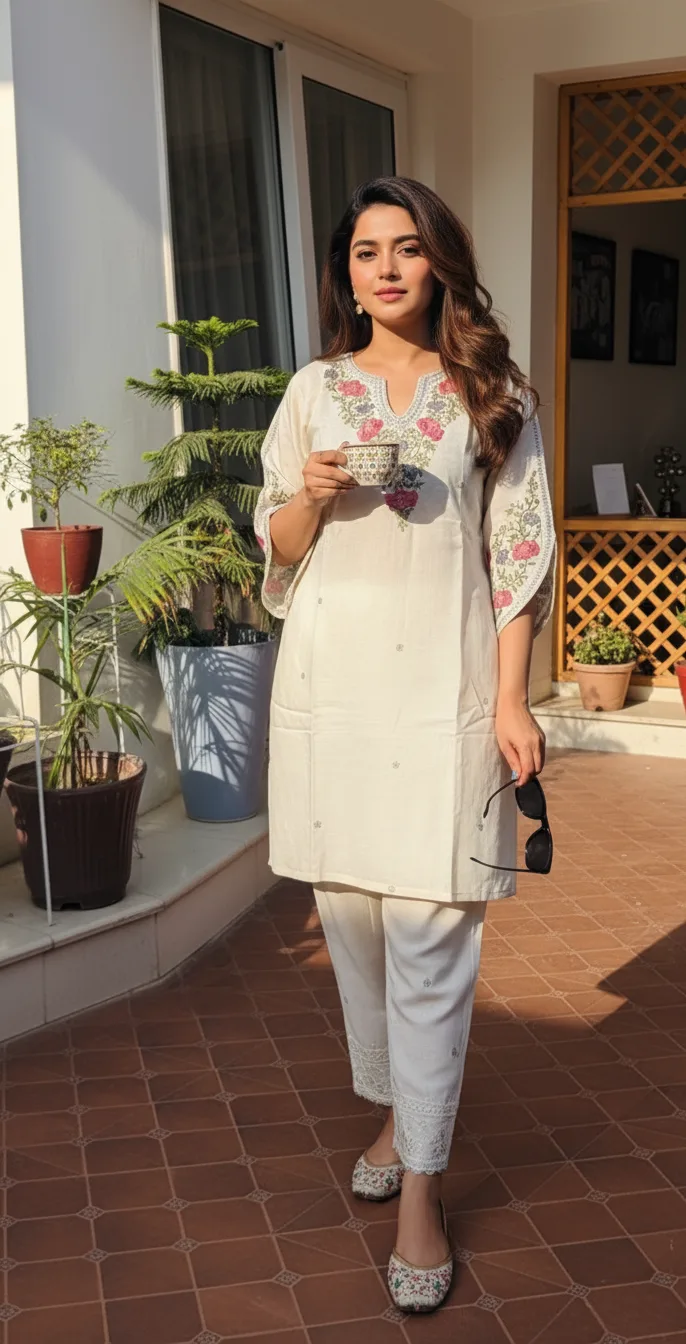- Style – Two-piece Co-ord Set (Kurta/Tunic and Straight Trousers).