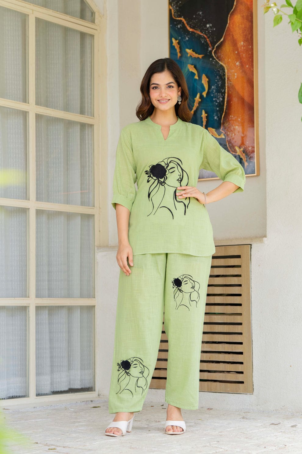 Pant: Coordinated straight-fit pants with matching embroidered motif near the hem to balance the overall design.
