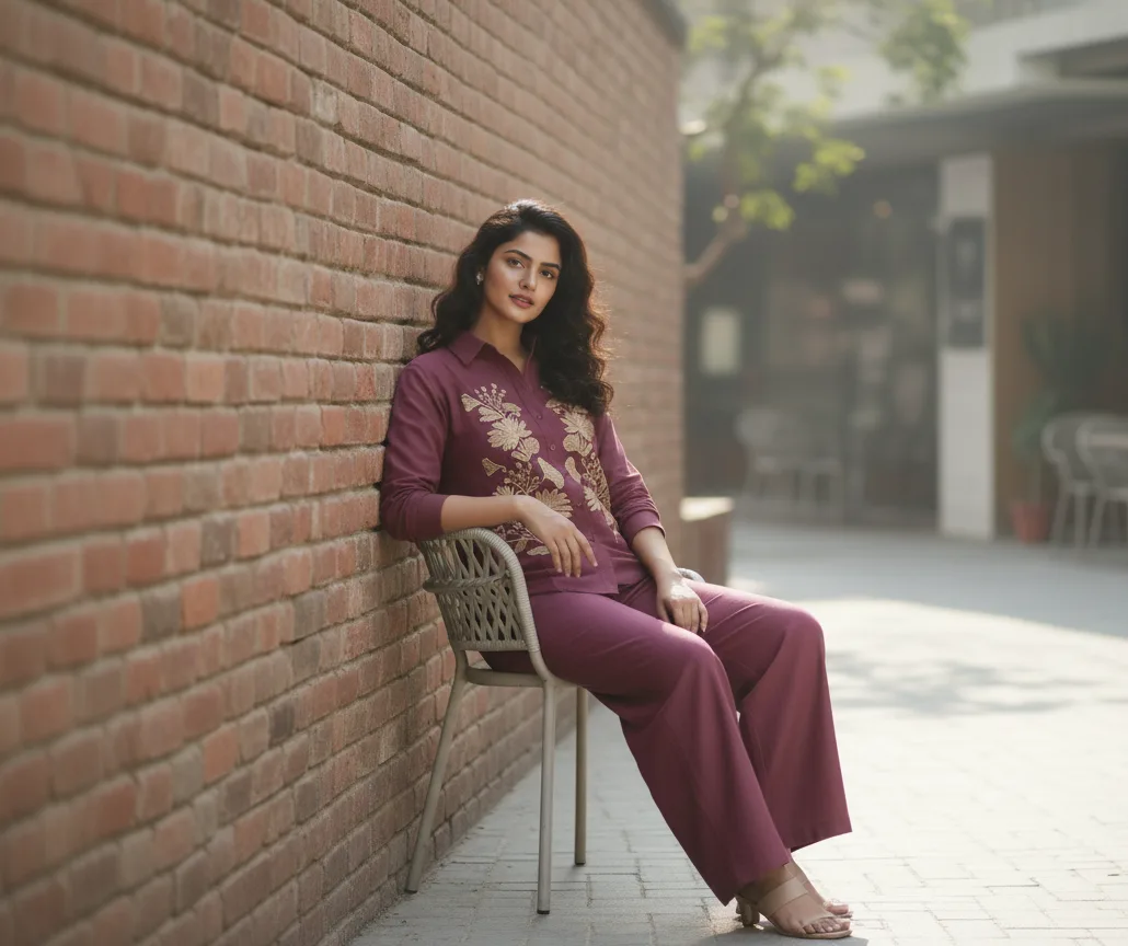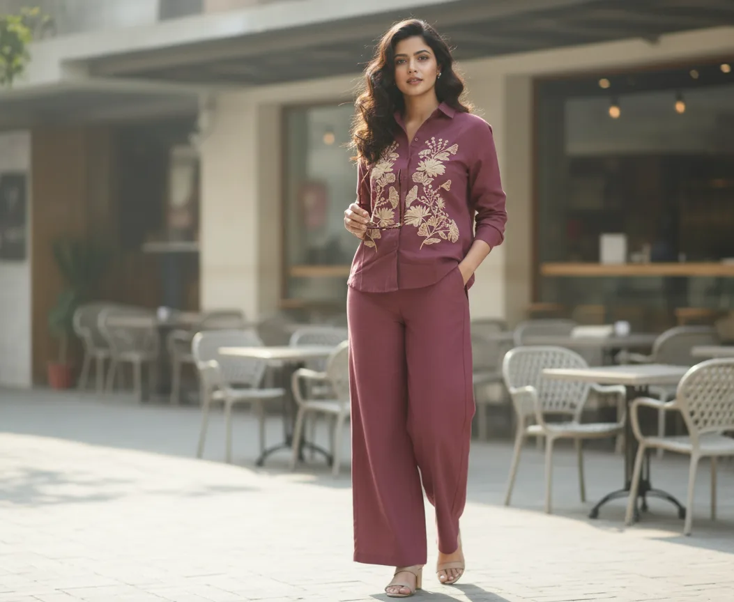 Type: Stylish Maroon Co-ord Set featuring a collared shirt and wide-leg trousers.