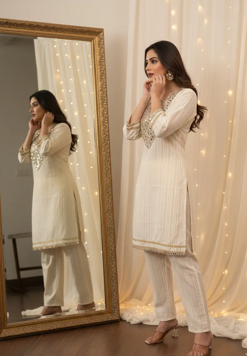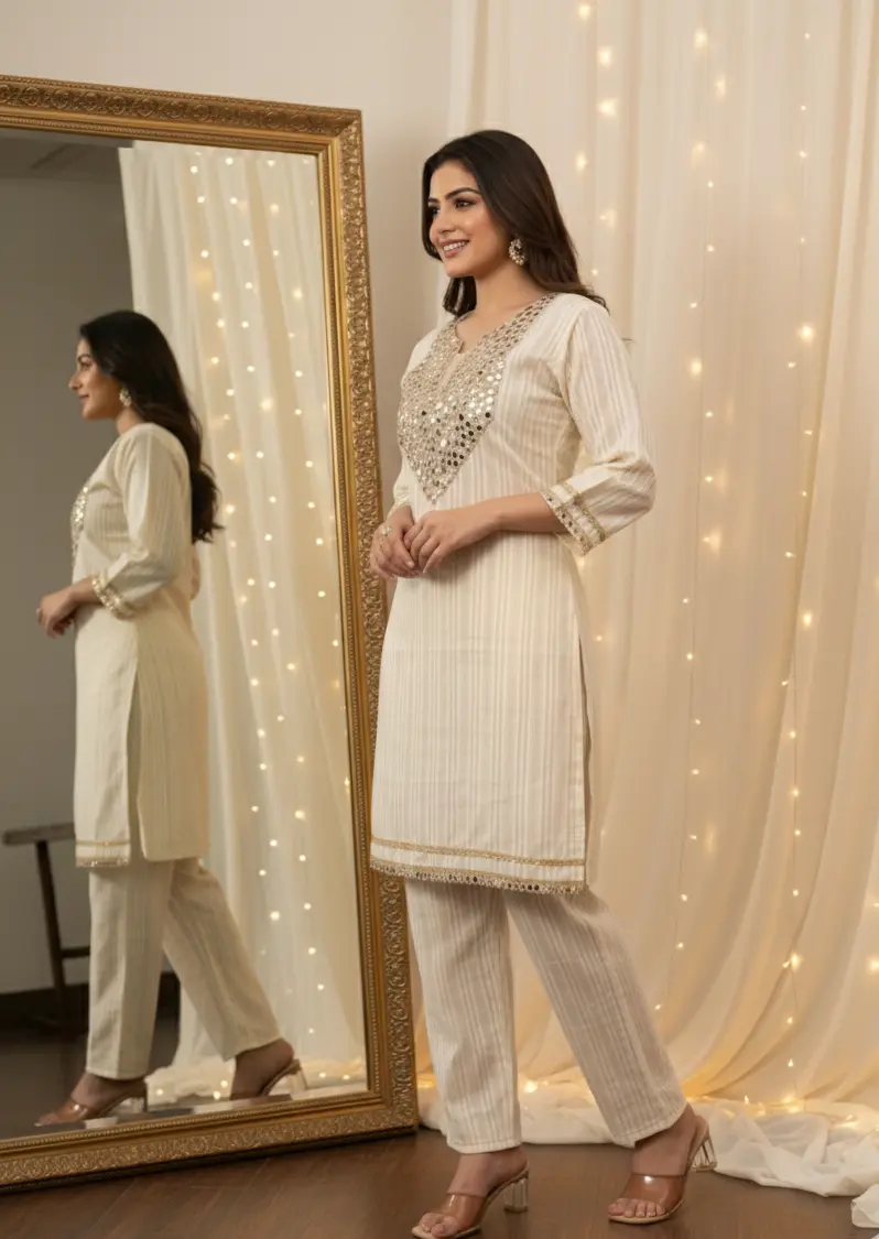 Top: Ivory straight-cut kurta adorned with intricate mirror work and embroidery in a triangular yoke pattern at the neckline. Delicate golden lace trims the hem and sleeves, adding festive elegance.