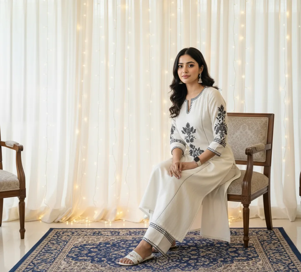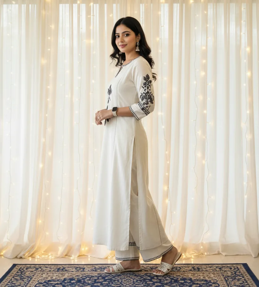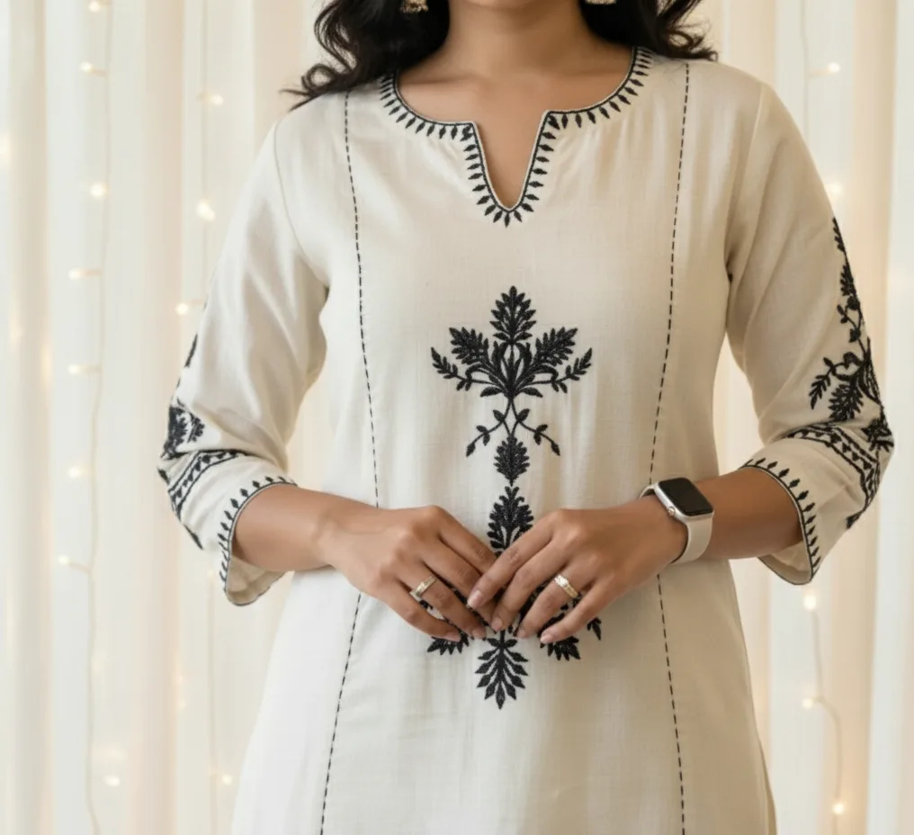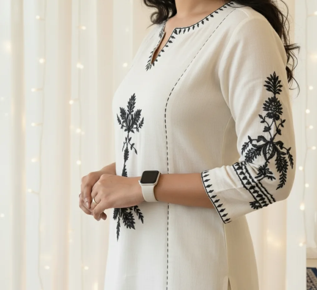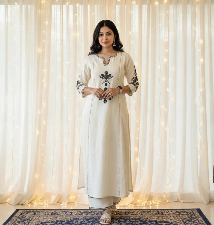 Color: Elegant Ivory base highlighted with striking black embroidery.