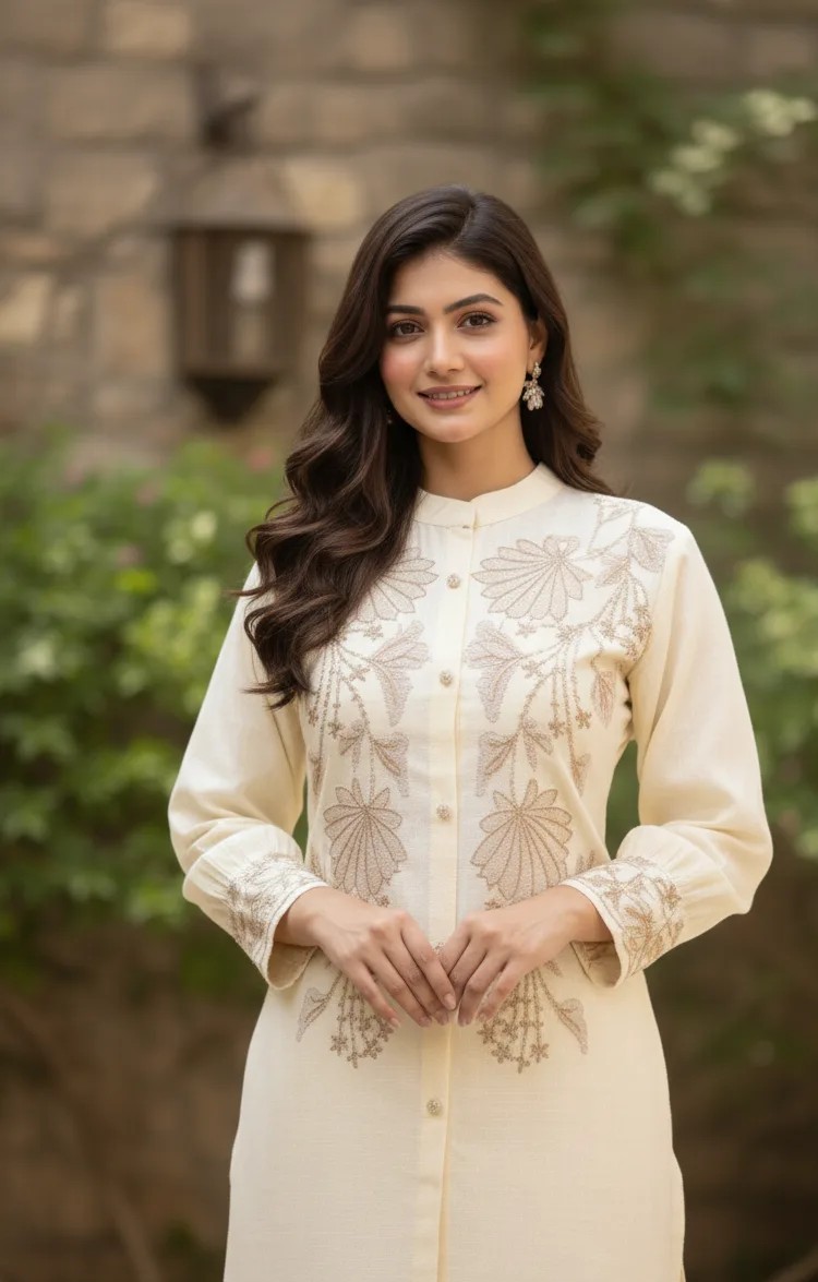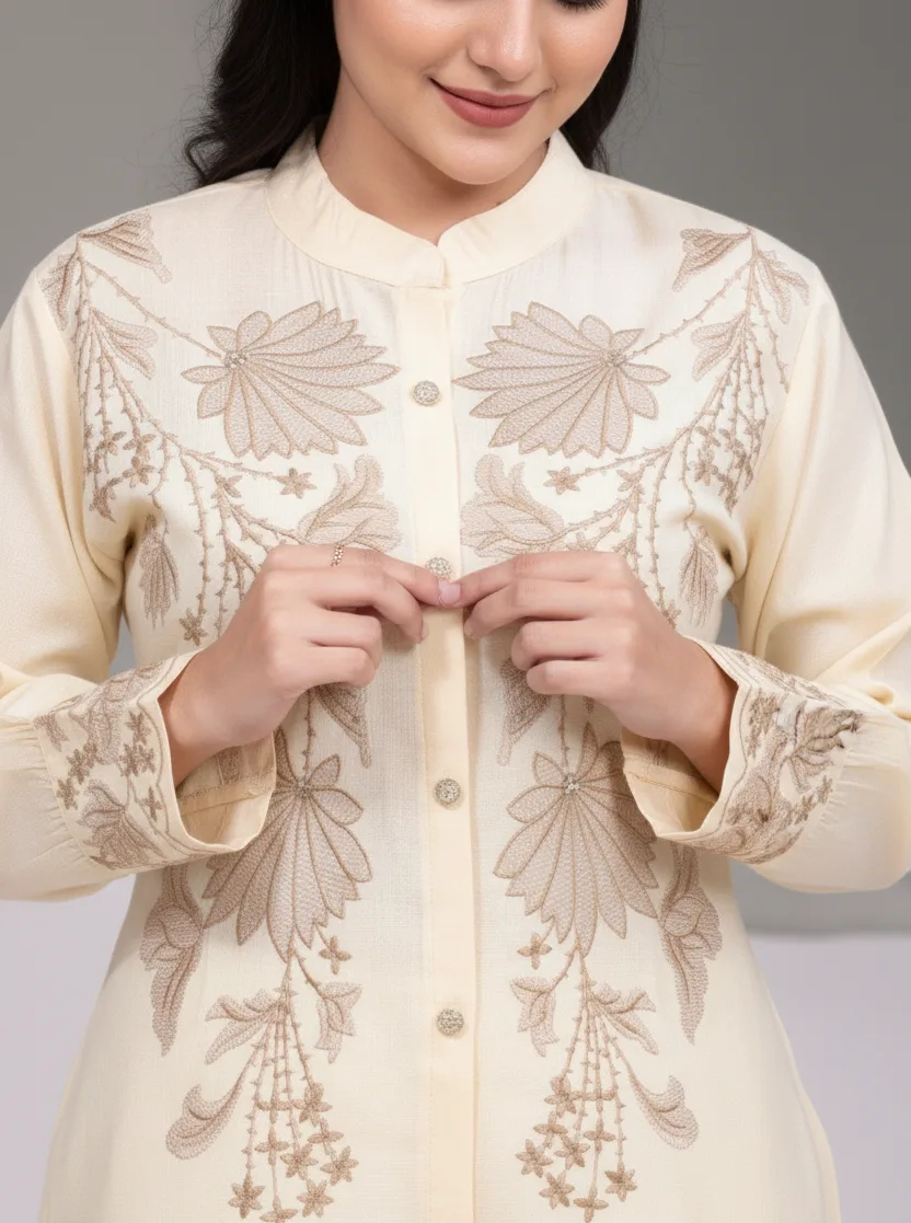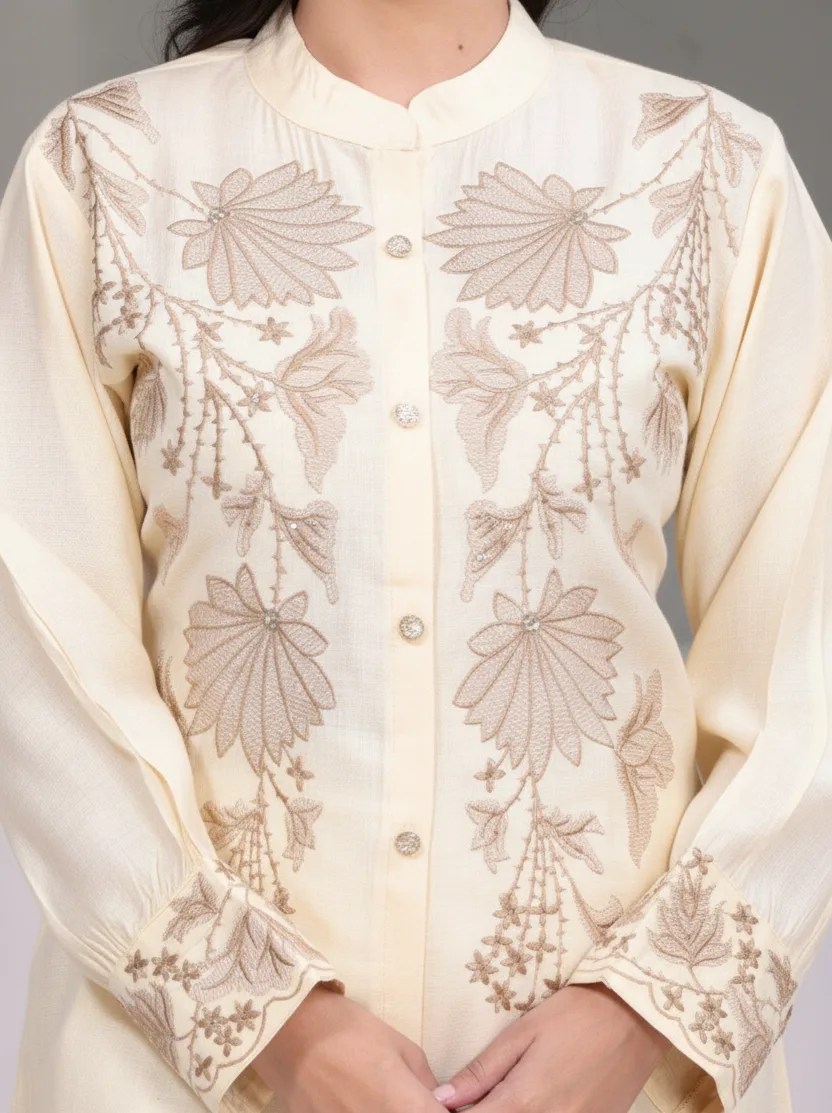 Design: Intricate tonal Floral and Vine Embroidery on front and cuffs.