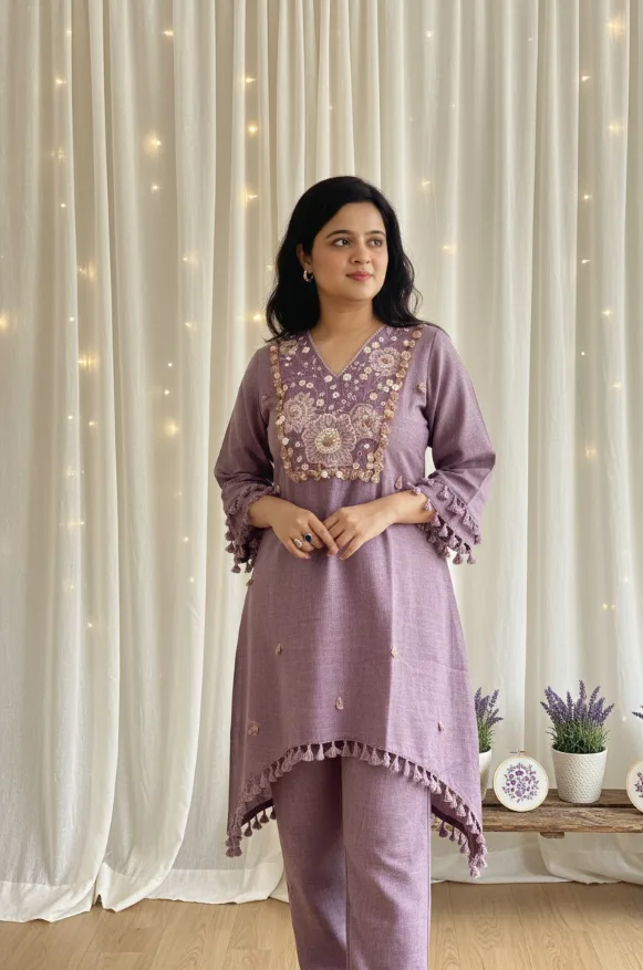 Product: Jute Style Heavy Neck Embroidery and Tassel Work Co-ord Set