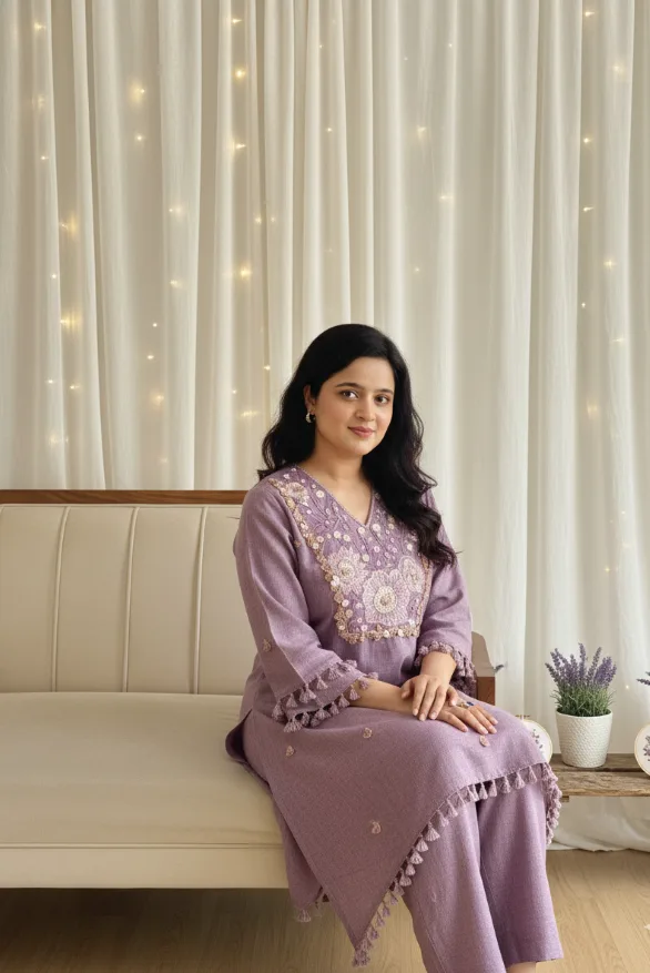 Key Design Features: Heavy Neck Embroidery: Features intricate, detailed embroidery around the V-neckline in complementary tones, adding a rich, festive, or semi-formal look.