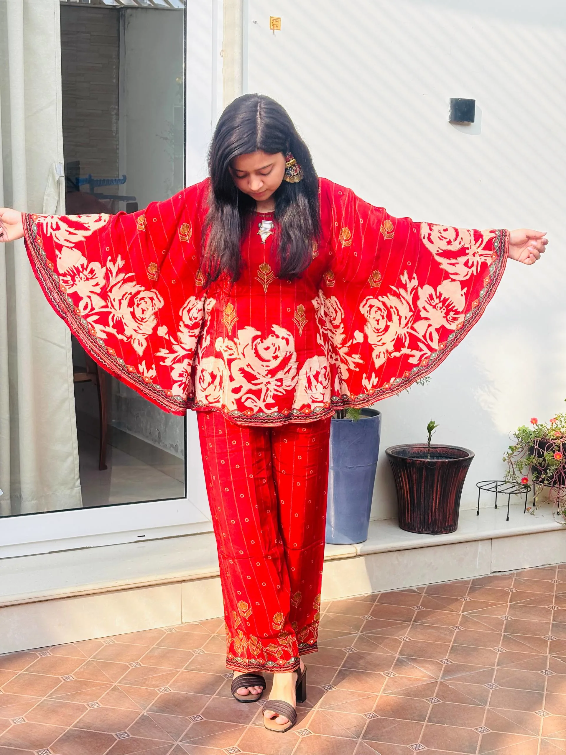 Silhouette: Relaxed and comfortable fit; the kaftan top offers a flattering drape, and the trousers ensure ease of movement.