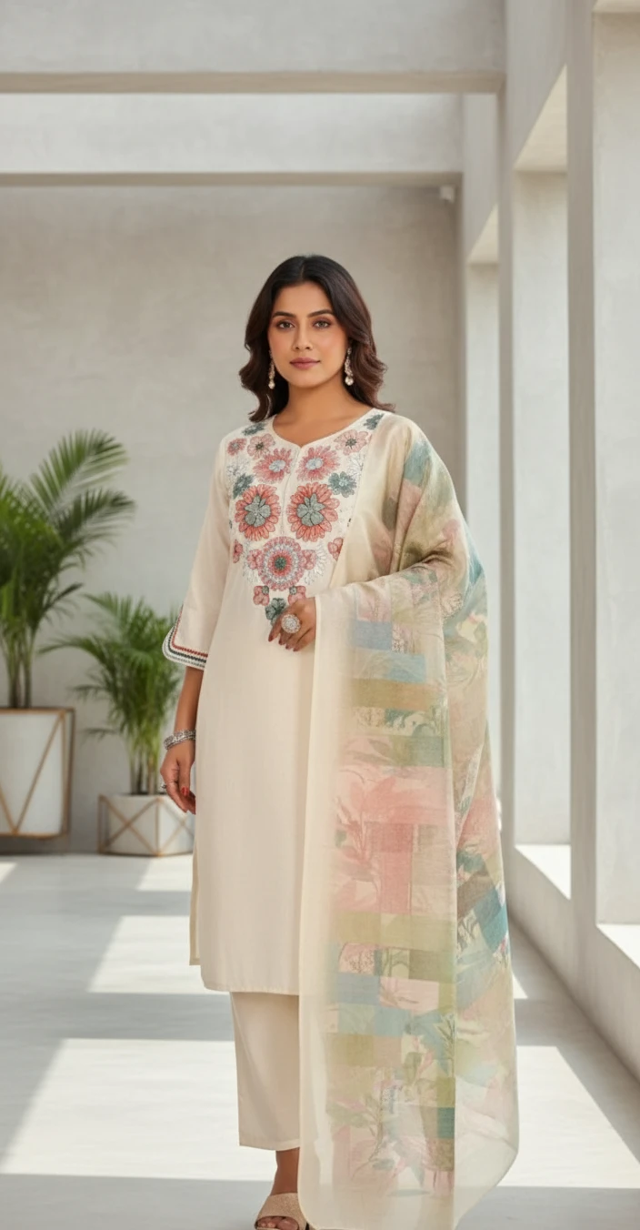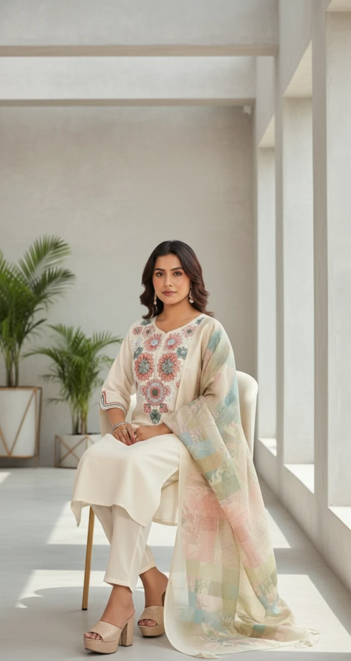 Kurta: Straight-cut cream kurta with structured silhouette for refined elegance.