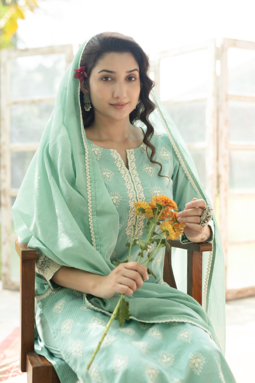 Pant: Straight-fit pants in matching seafoam green tone, with dainty embroidered floral motifs along the hemline.