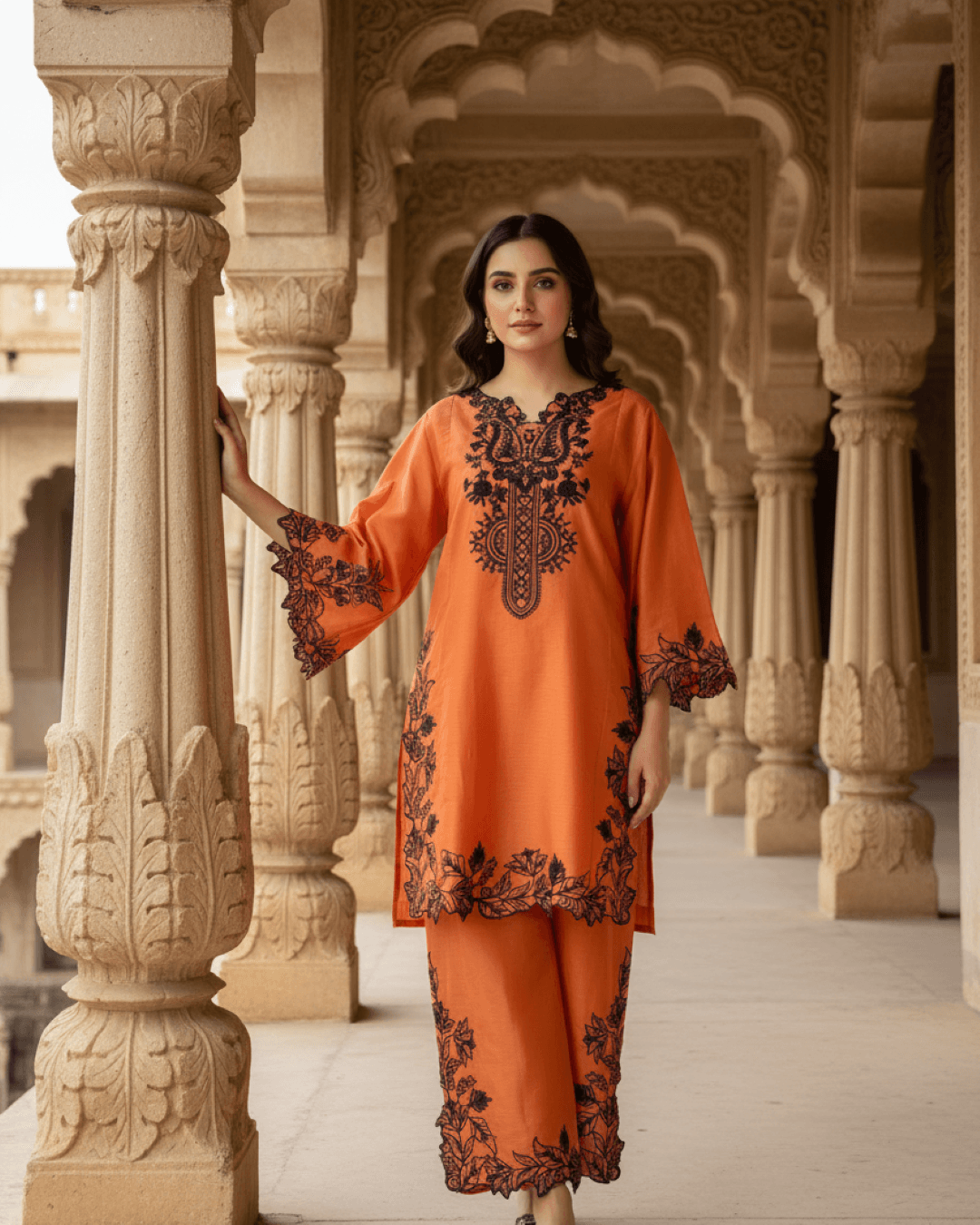 Embroidery Style: Black thread embroidery in floral + ornamental motifs, providing a dramatic contrast against the bright base.