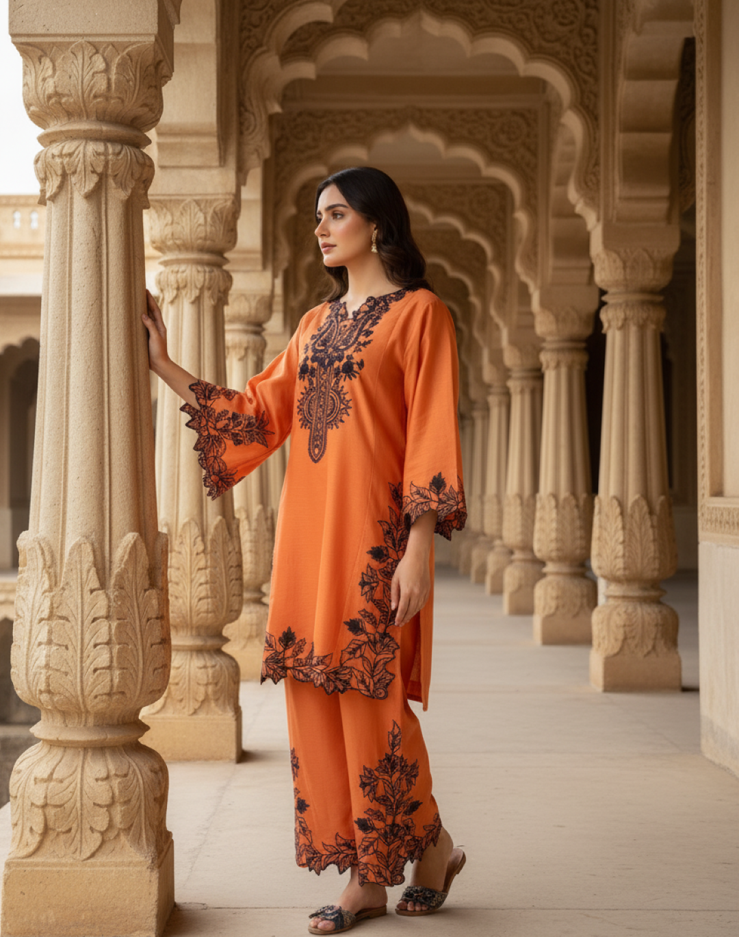 Pants: Matching straight-fit pants in rust orange, finished with embroidered floral motifs at the hem, tying the outfit together.