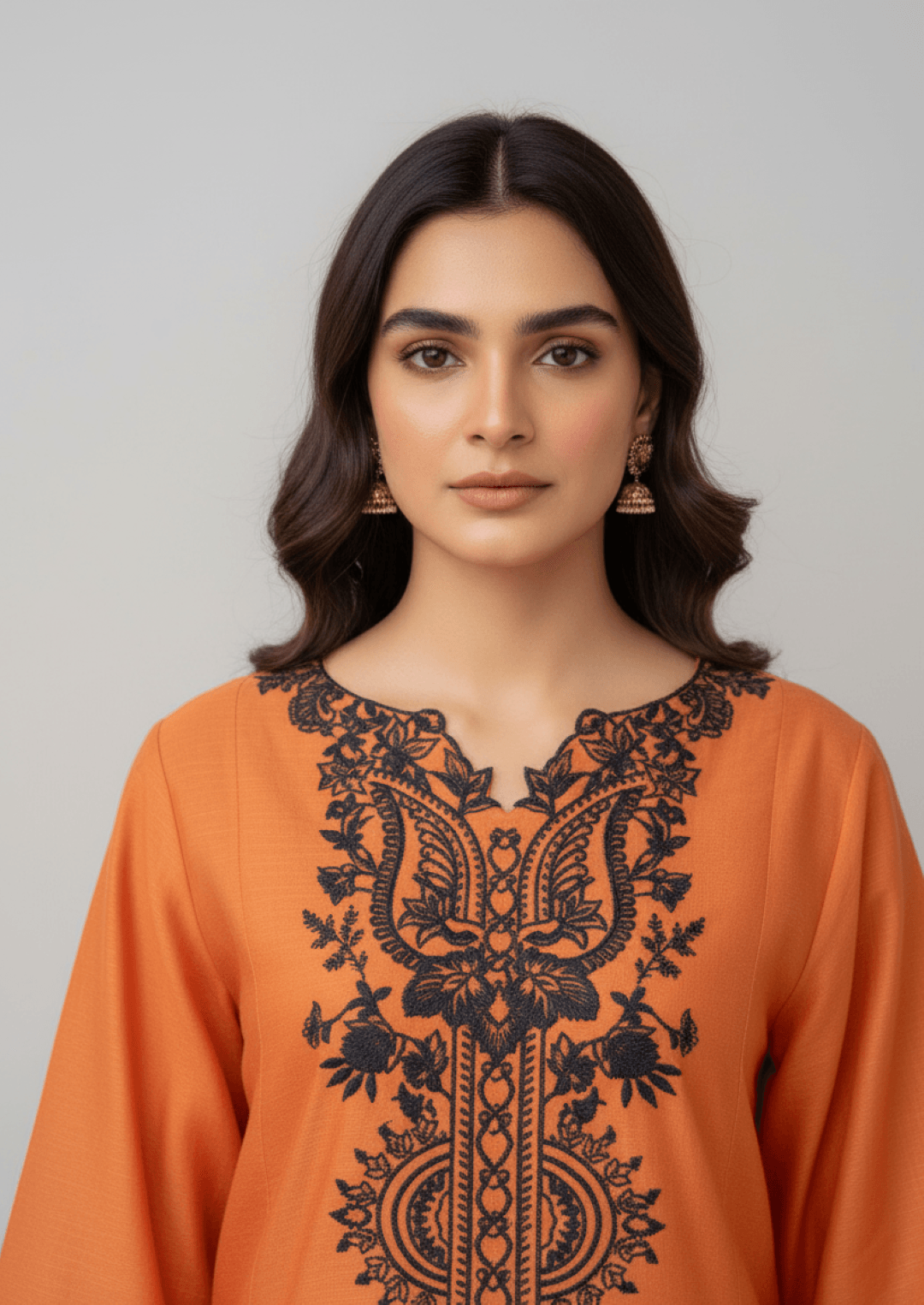 3 reviews for Naarangi saarangi – Rust Orange Embroidered Three – Piece Suit Set