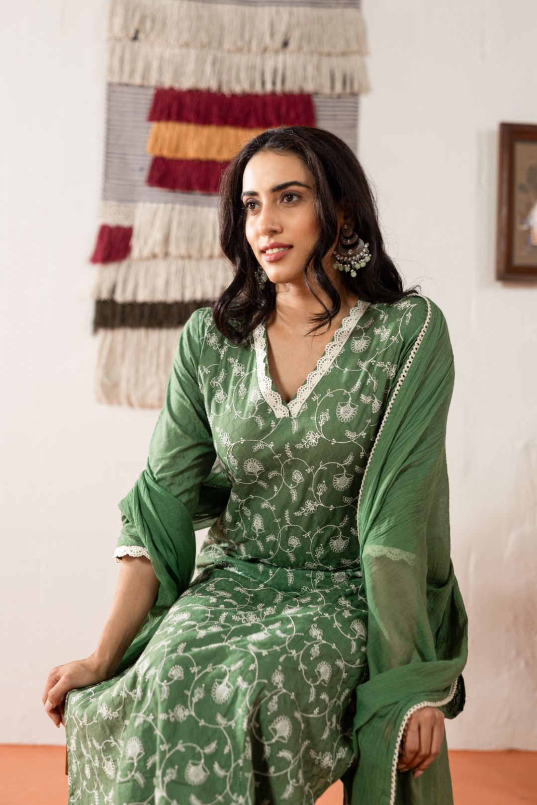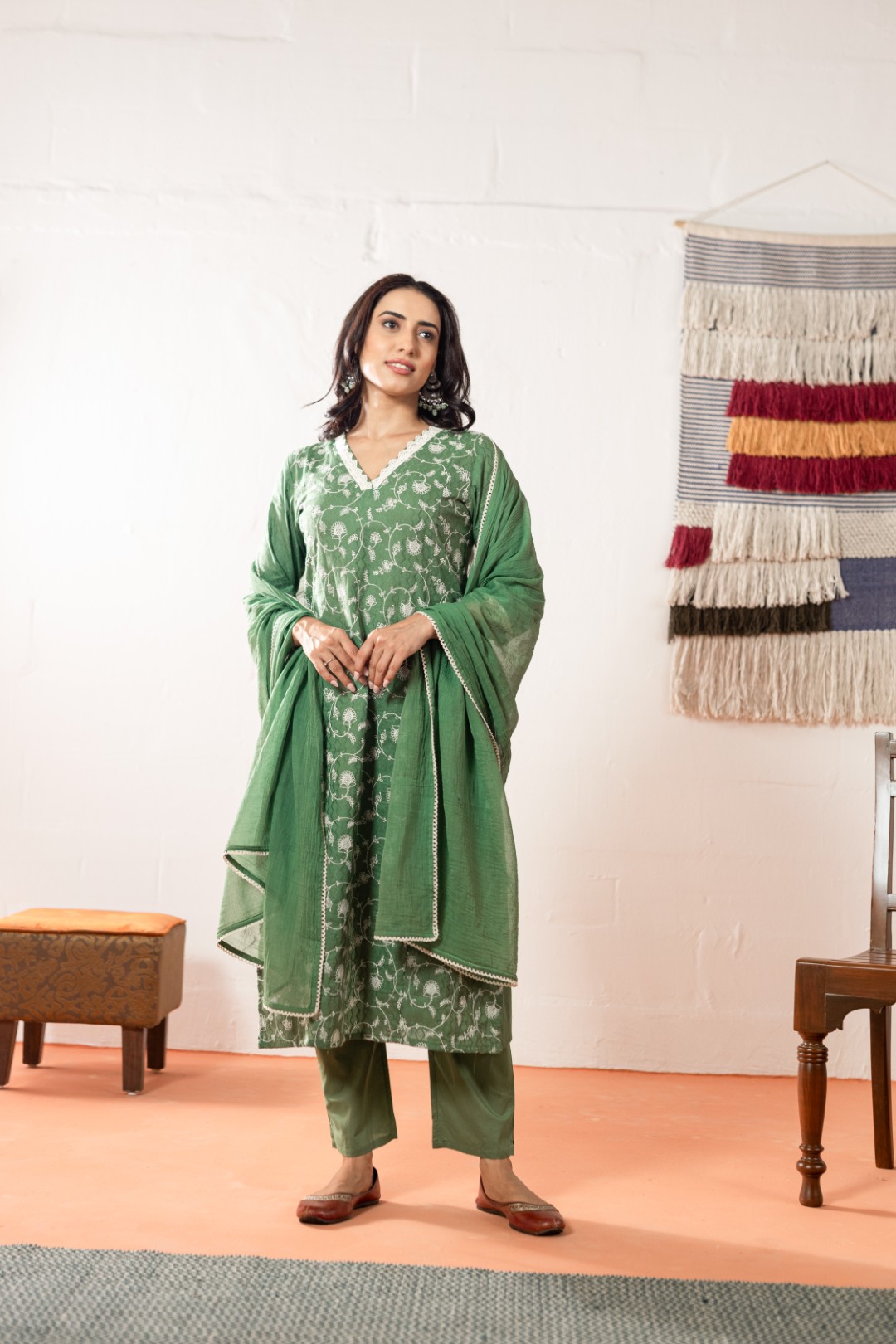 Dupatta: Lightweight green cotton dupatta with a fine lace-trimmed border for a polished ethnic touch.