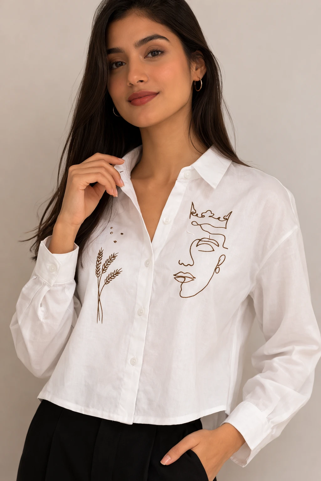 Design: Features unique brown line-art embroidery of a stylized face and floral wheat accents.