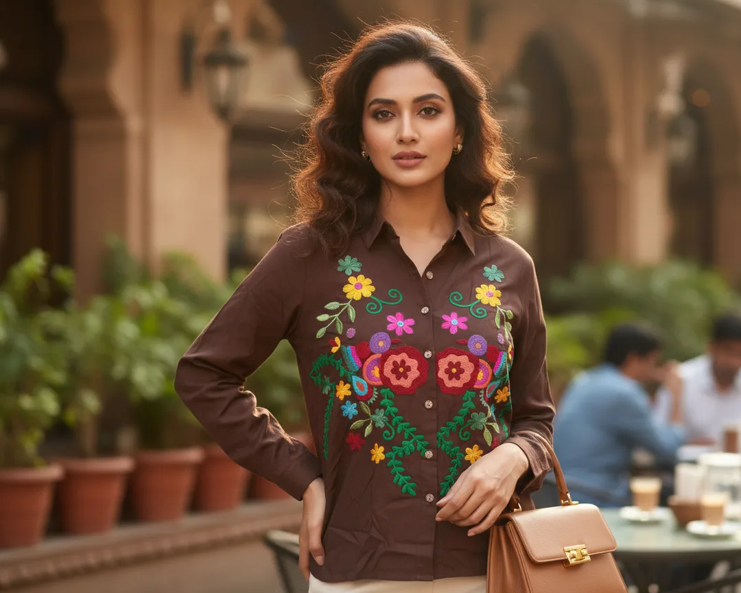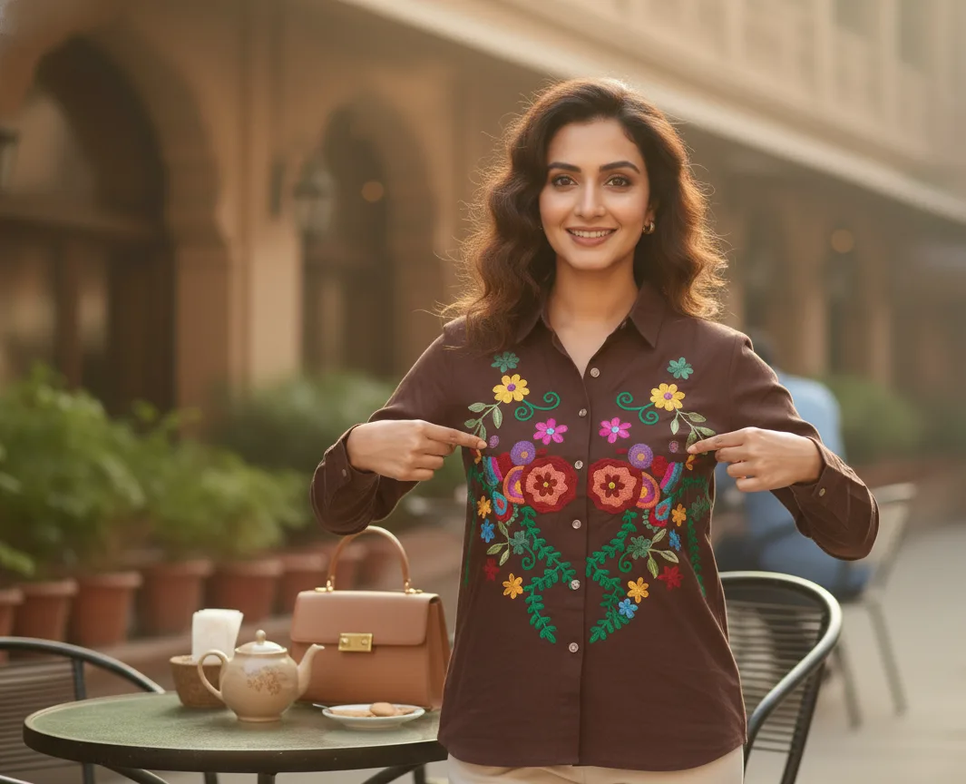 Design: Large, vibrant hand-embroidered floral and bird motif running down the front on either side of the placket.