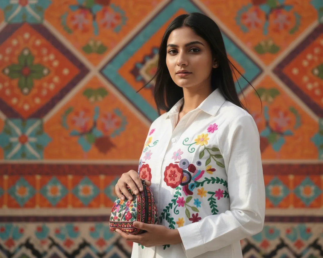 Color: White with Multi-color (Red, Pink, Blue, Yellow, Green) embroidery.