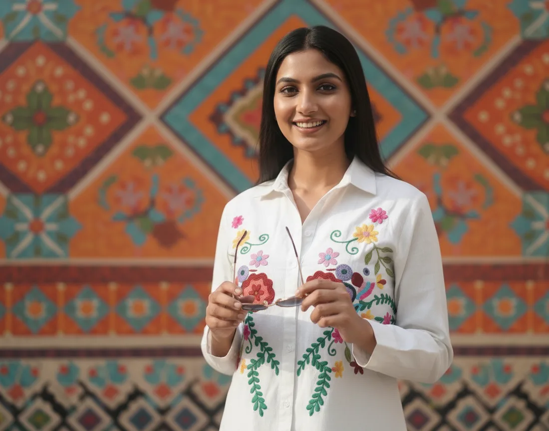 Design: Large, vibrant hand-embroidered floral and bird motif running down the front on either side of the placket.