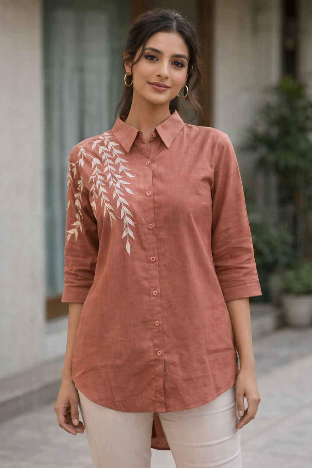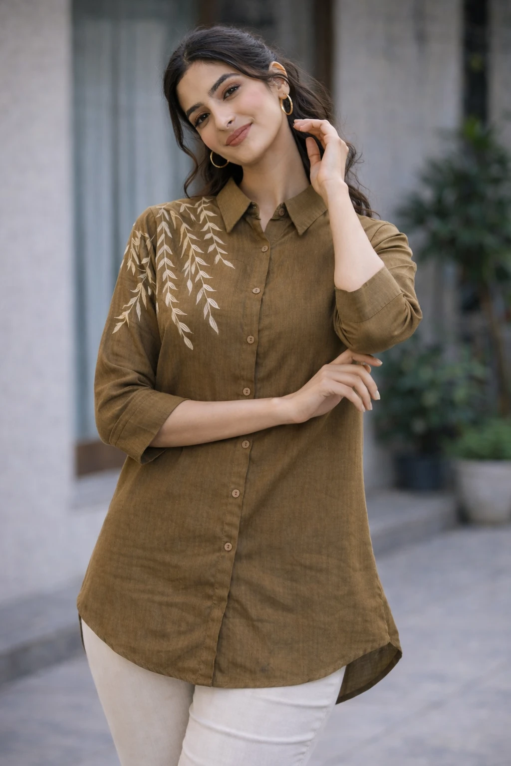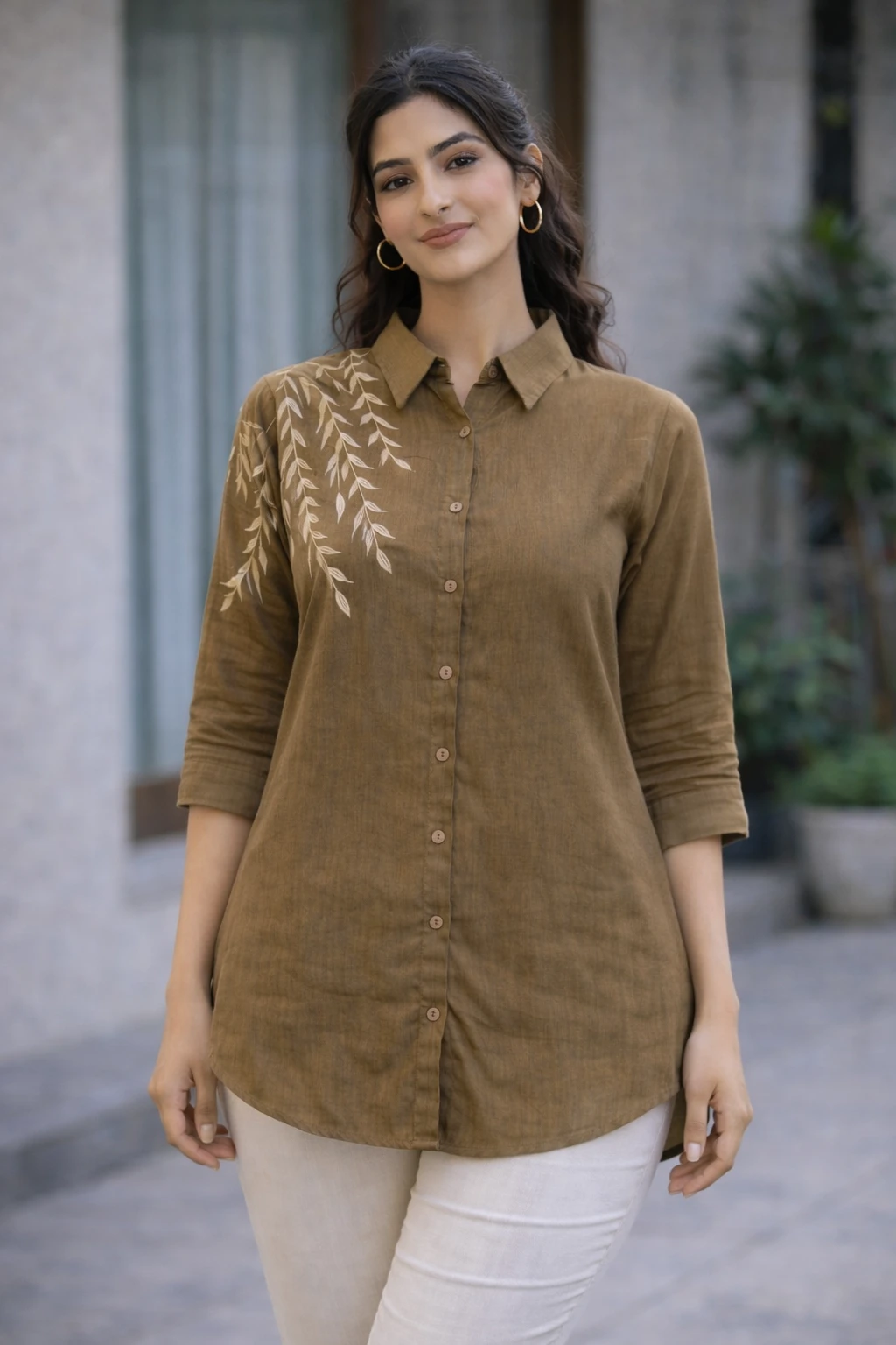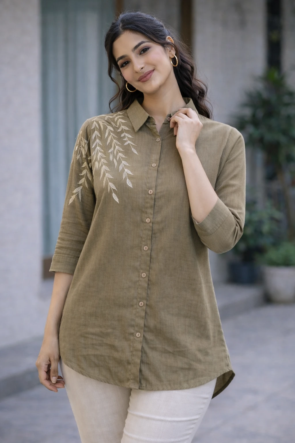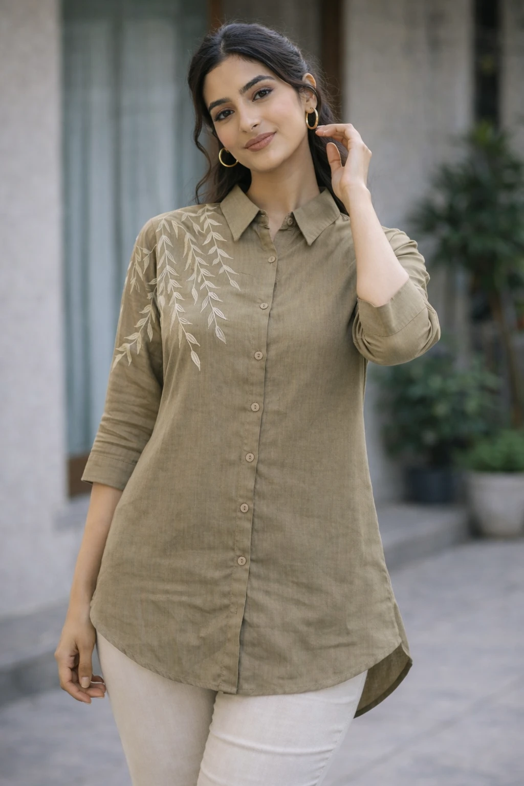 Design & Style: Elegant button-down shirt featuring a unique white leaf-vine embroidery cascading from the right shoulder down to the sleeves.
