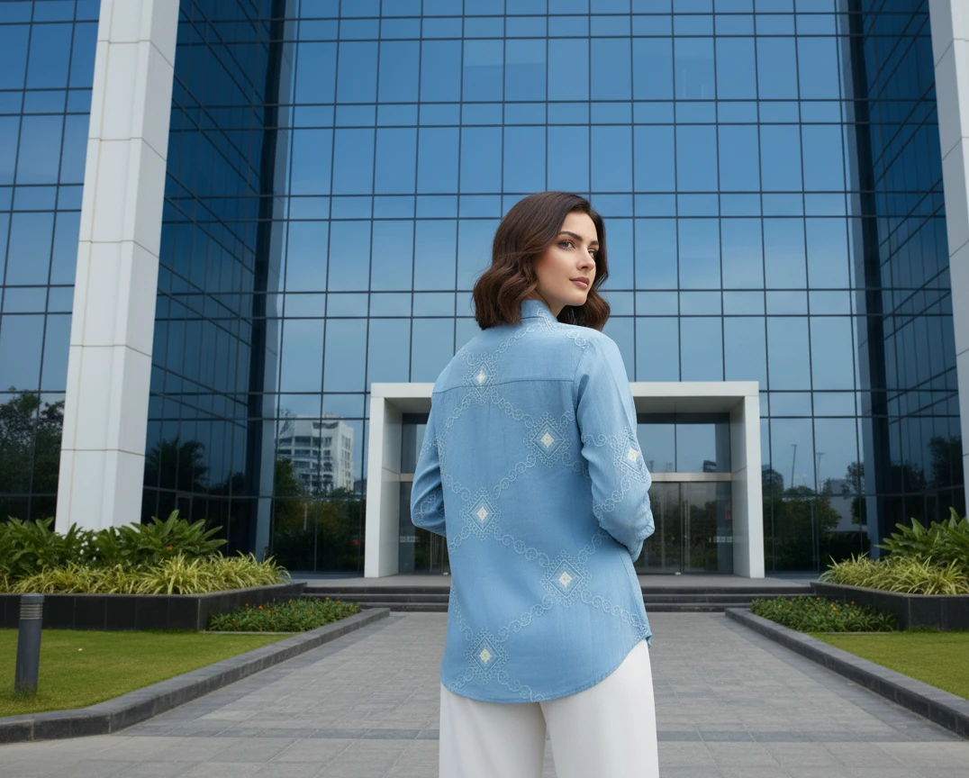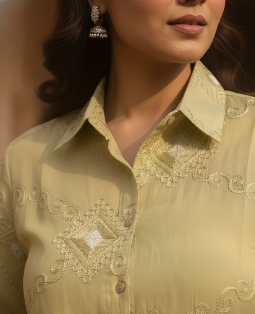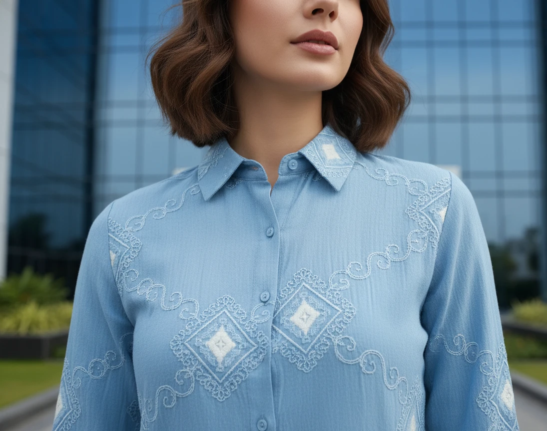 Embroidery Detail: Intricate design with prominent white diamond/square motifs and flowing, swirl-patterned stitching around them.