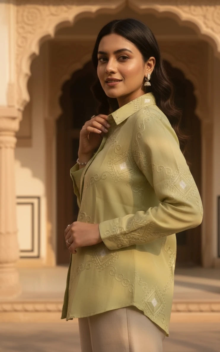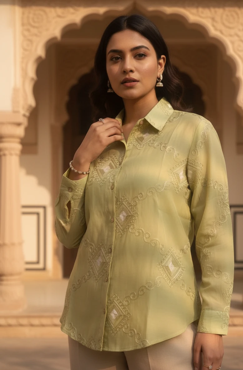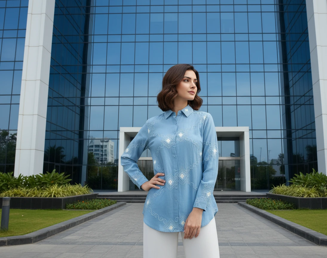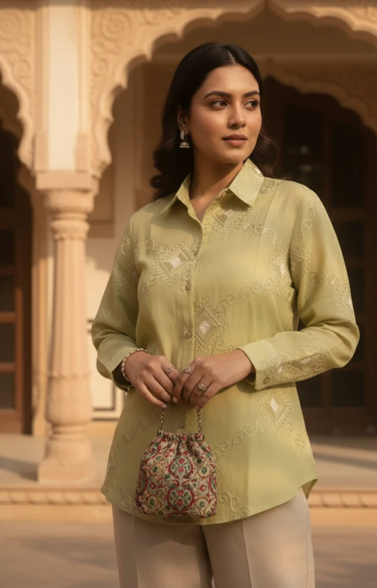 Embroidery Detail: Intricate design with prominent white diamond/square motifs and flowing, swirl-patterned stitching around them.