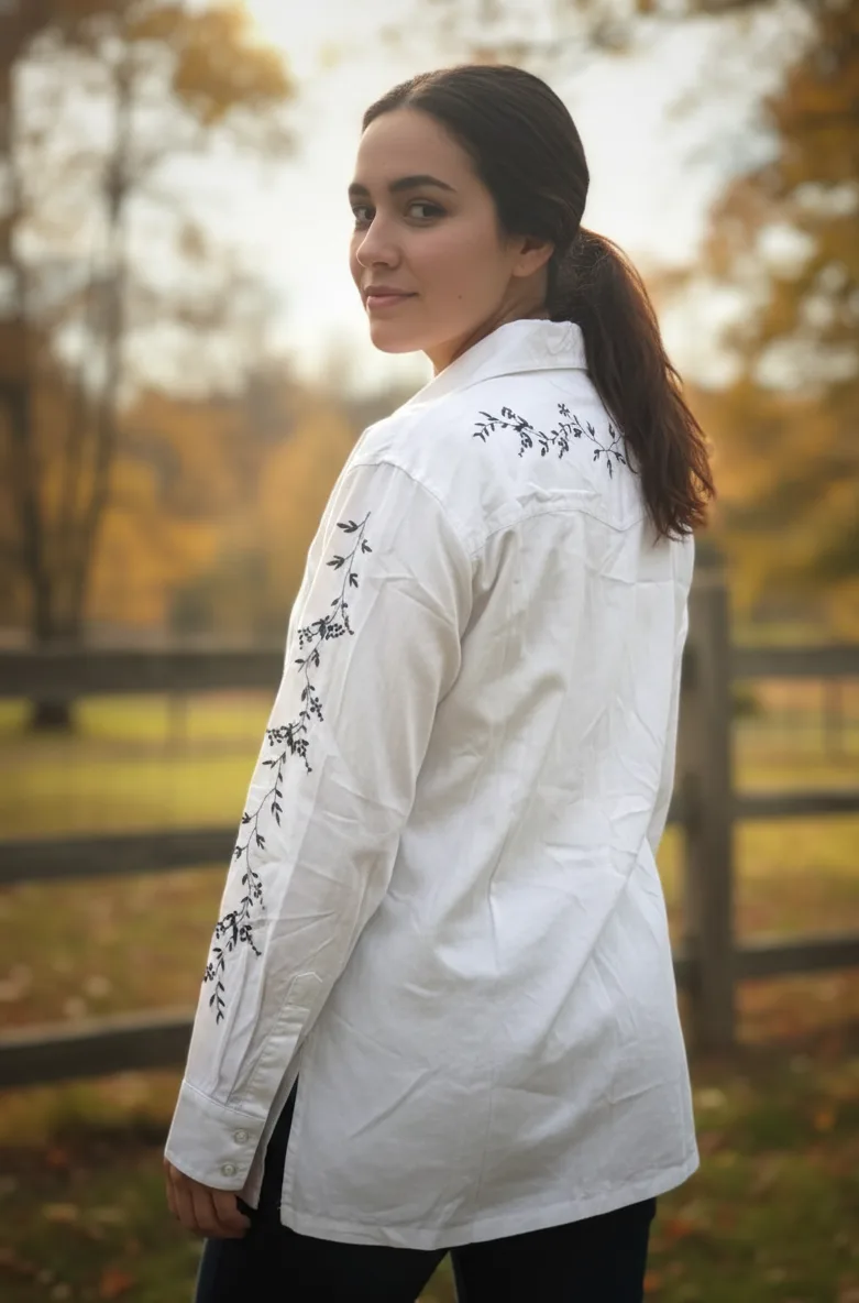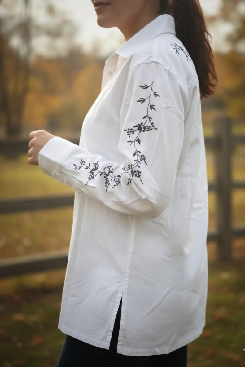 Detailing: Bold Black Floral Vine Embroidery for a sharp, striking contrast.