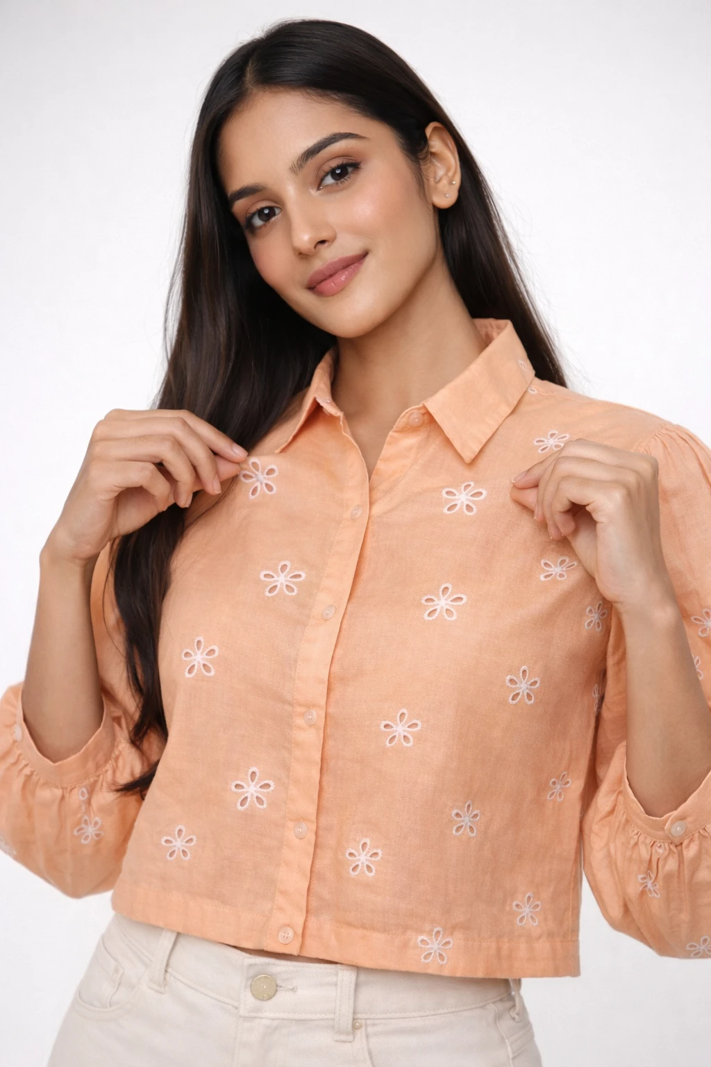 Design: Elegant peach-colored button-up shirt featuring delicate white floral eyelet embroidery throughout.