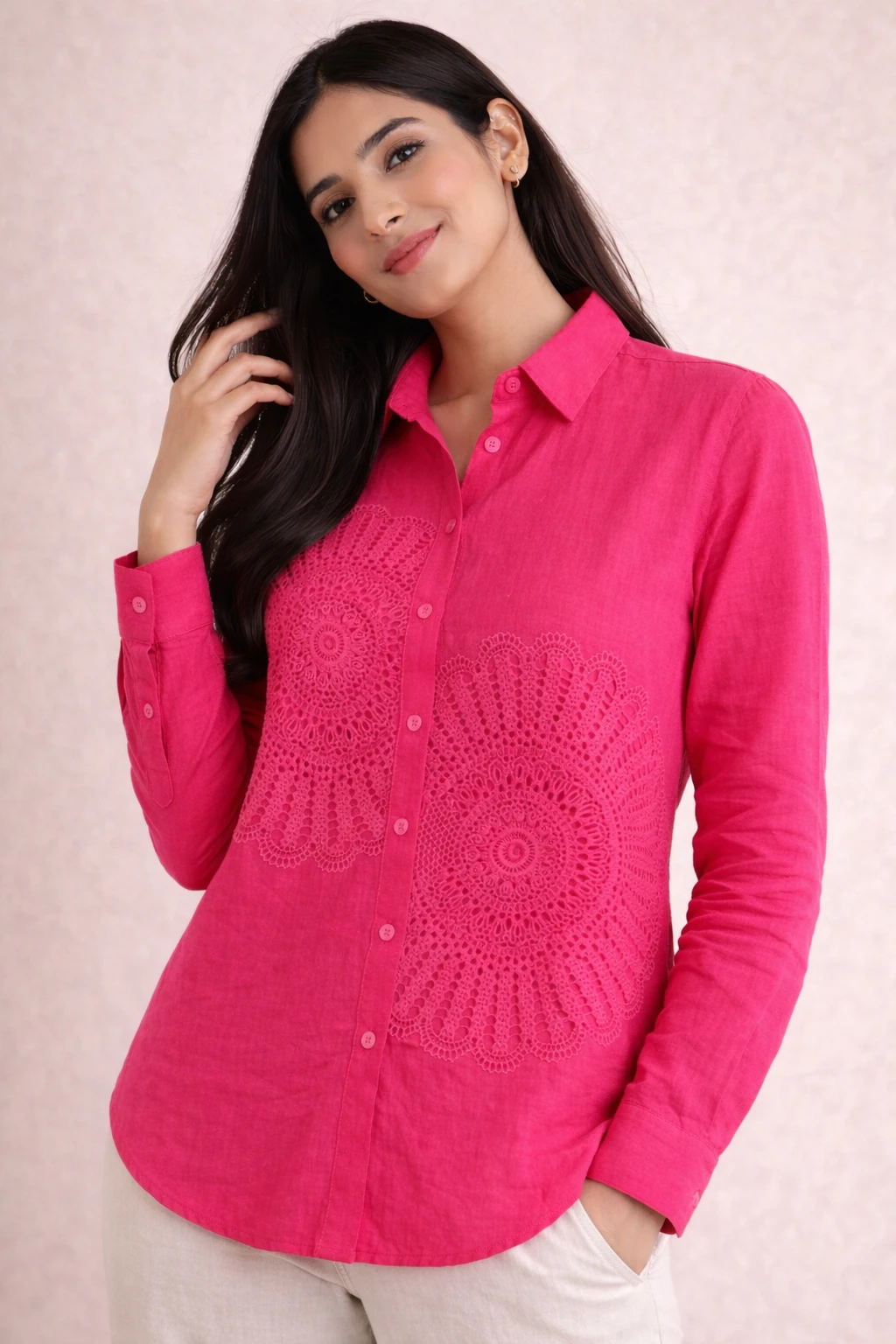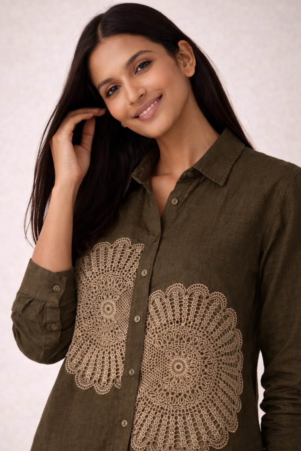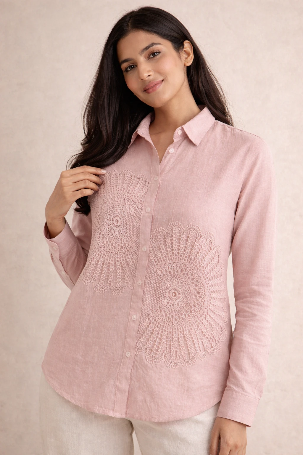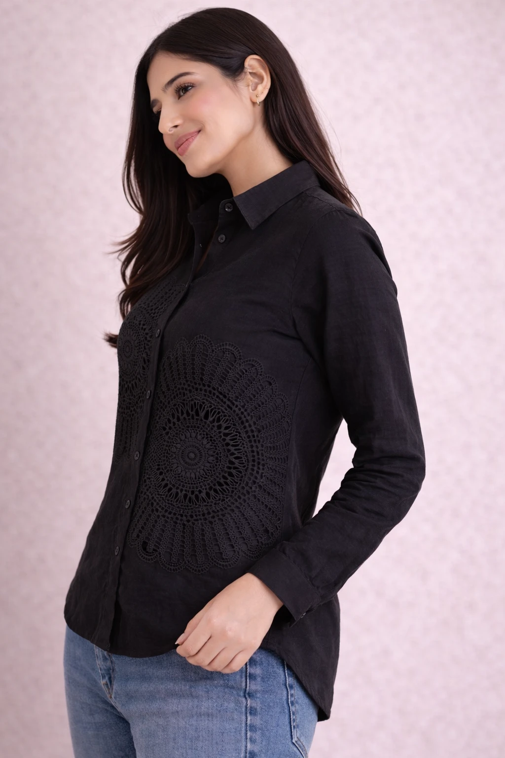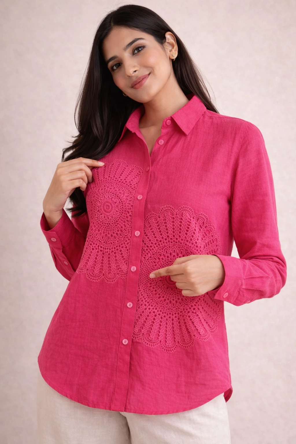 Design: A crisp, white button-down shirt featuring two distinctive, oversized circular lace medallions on the front.