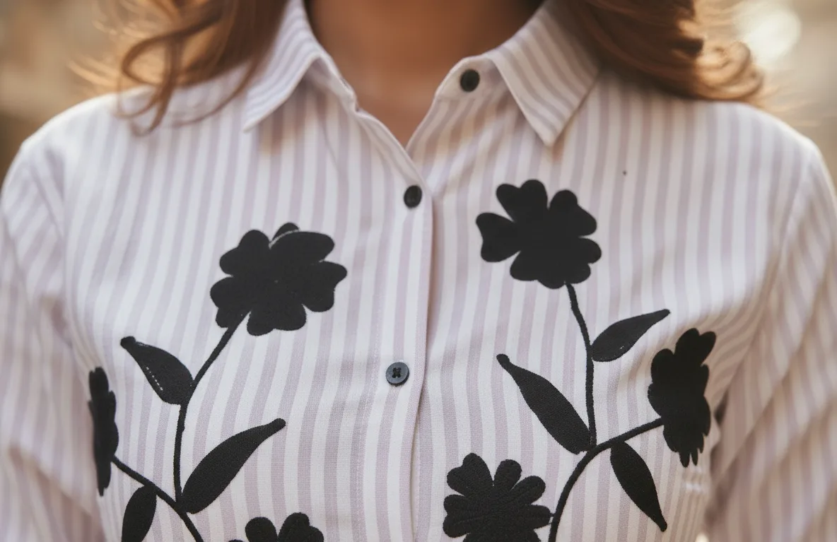 Color: White (or very light pink/lilac) with a fine vertical stripe pattern and black floral appliques.