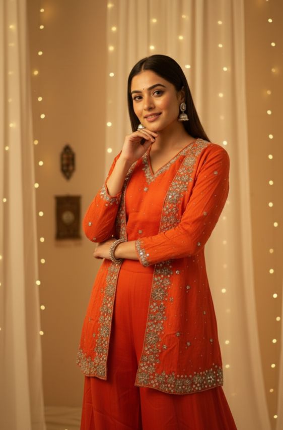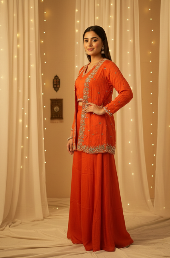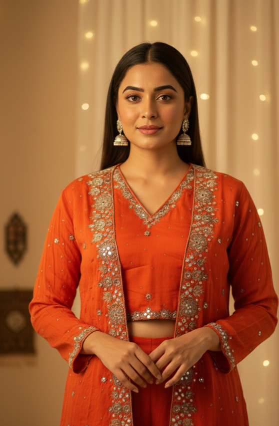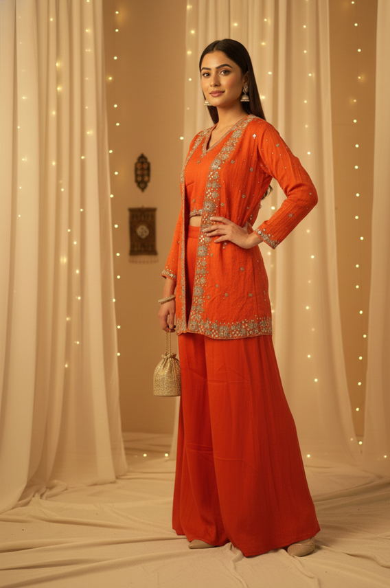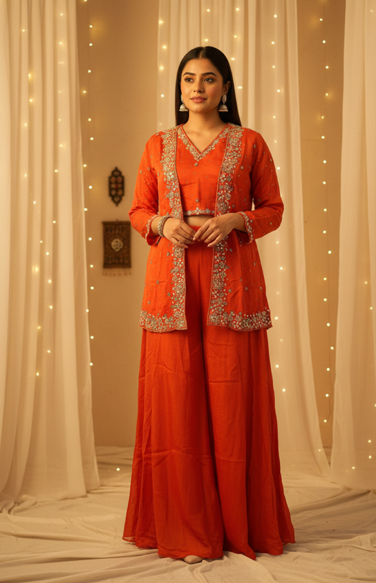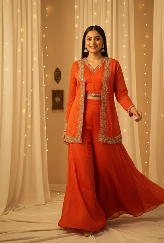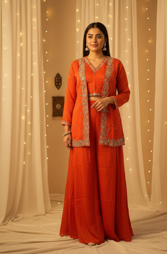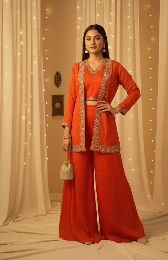 Style: Modern 3-Piece Ethnic Co-ord Set (Crop Top, Palazzo, and Shrug).