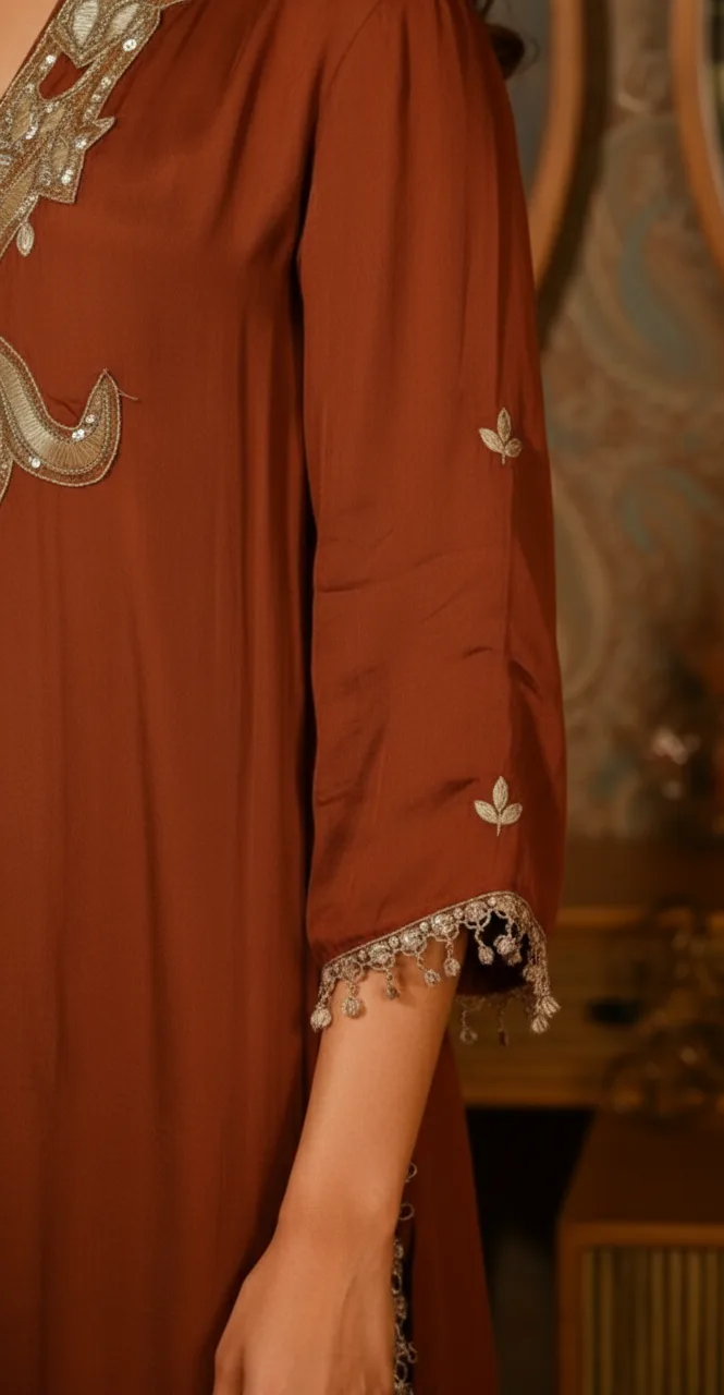 Work Placement: Intricate, handcrafted embroidery is prominently applied for a rich, high-quality finish.