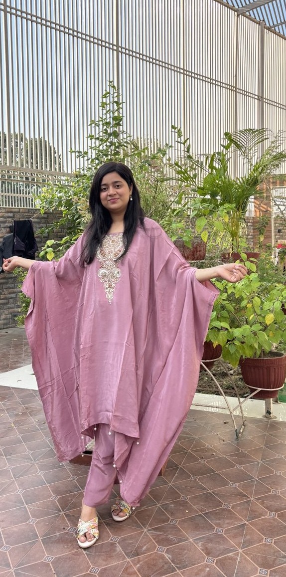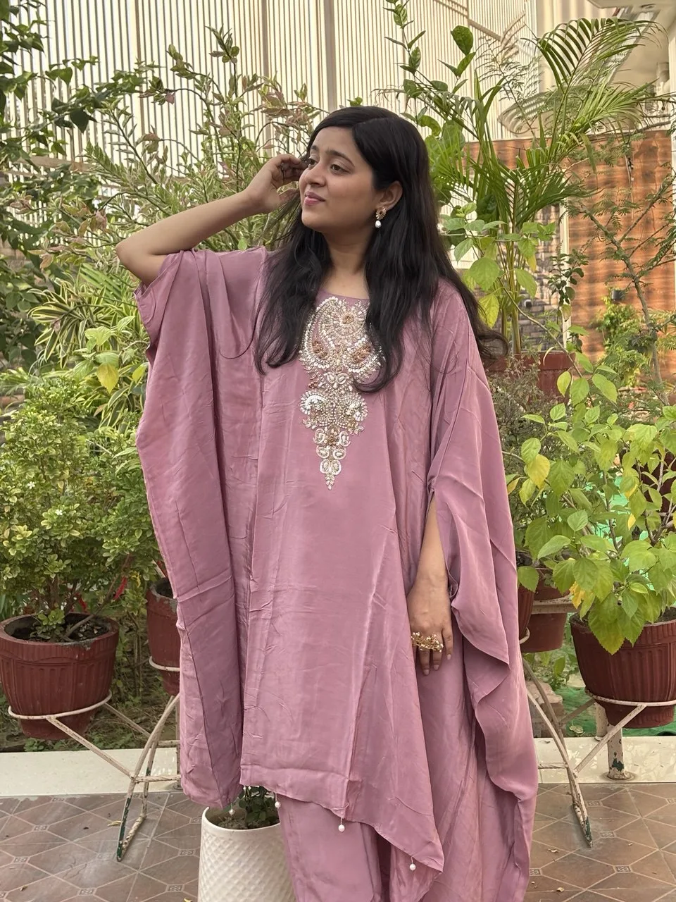 Style: Relaxed Kaftan Kurta and comfortable wide-leg elasticated trousers.