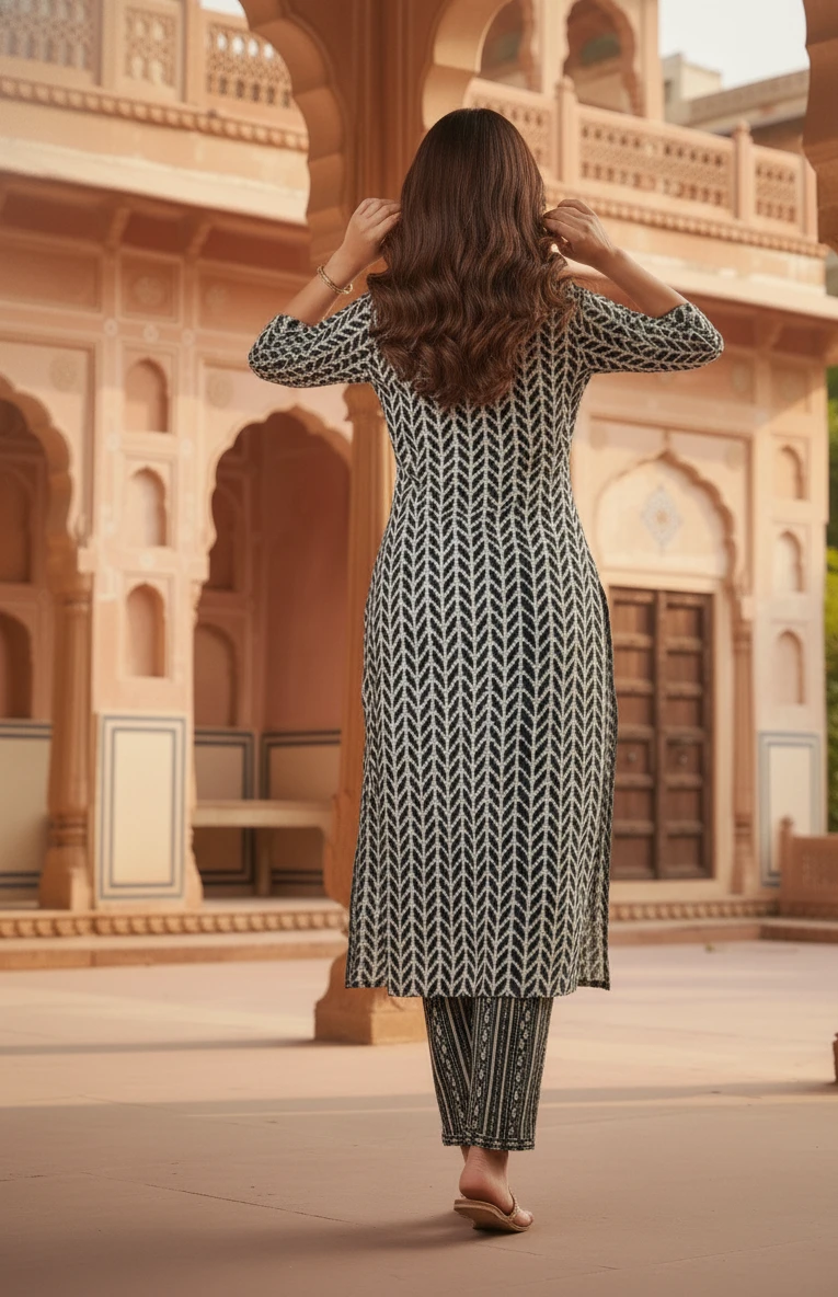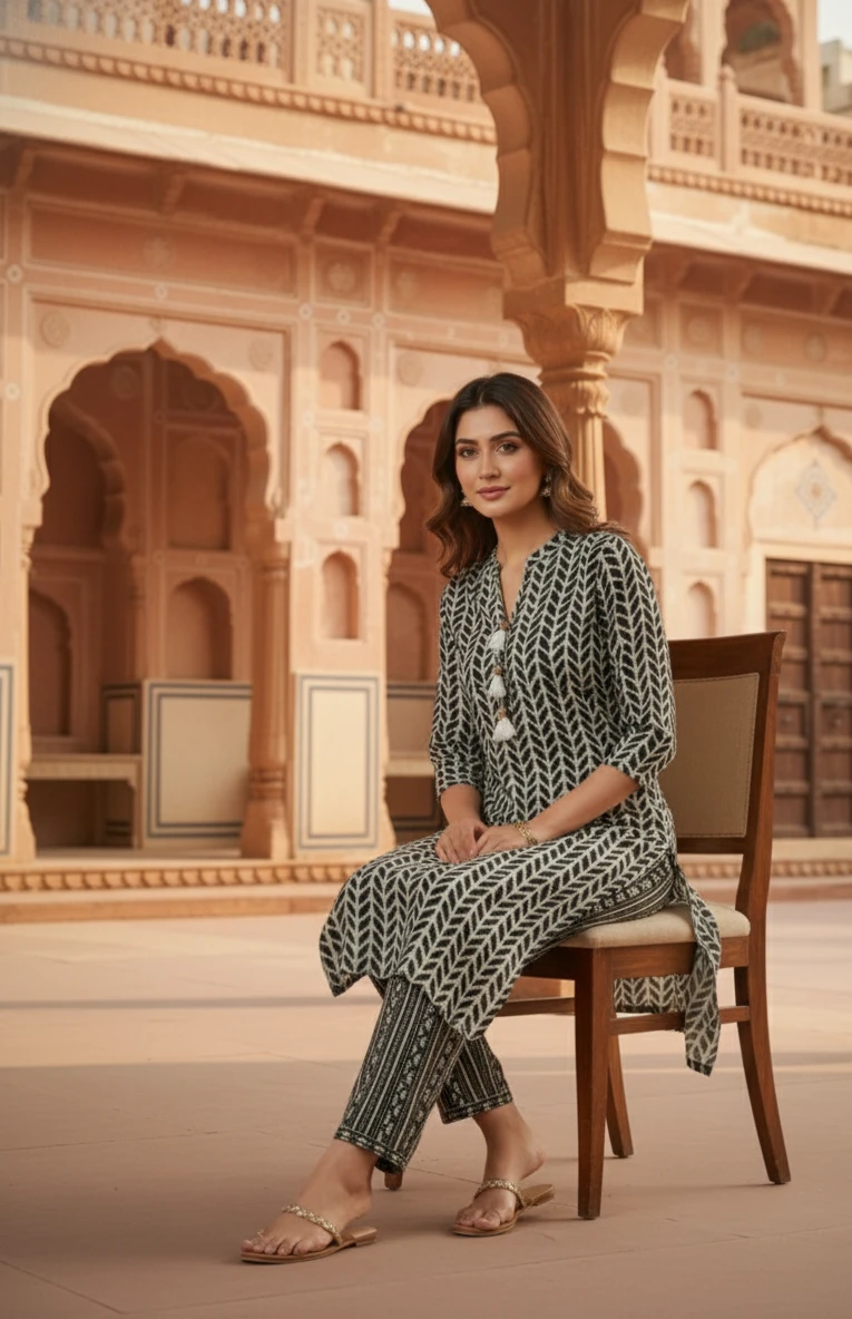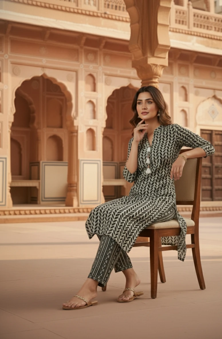 Style: A contemporary yet traditionally inspired straight-cut kurta set featuring a three-quarter sleeve kurta and matching Pant.
