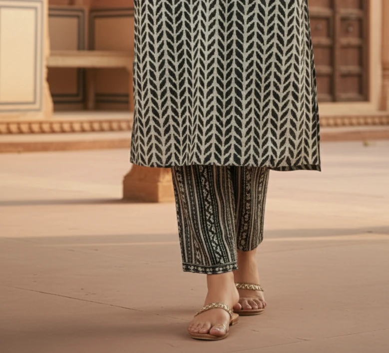 Bottom Wear: Matching straight pants that feature a complementary or slightly contrasting vertical geometric print in the same black and grey tones.