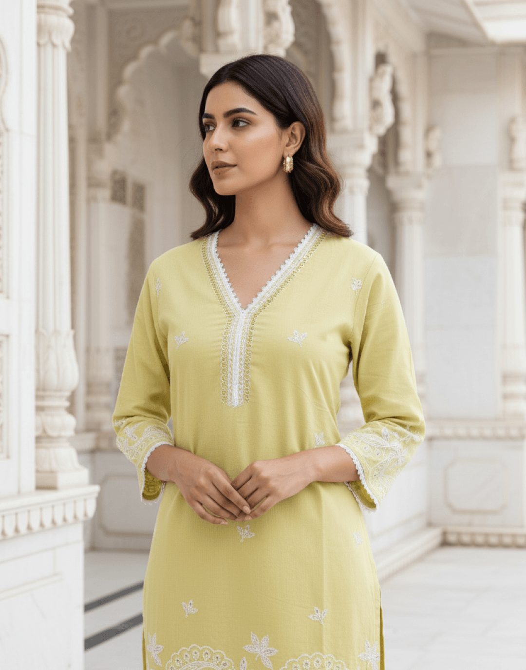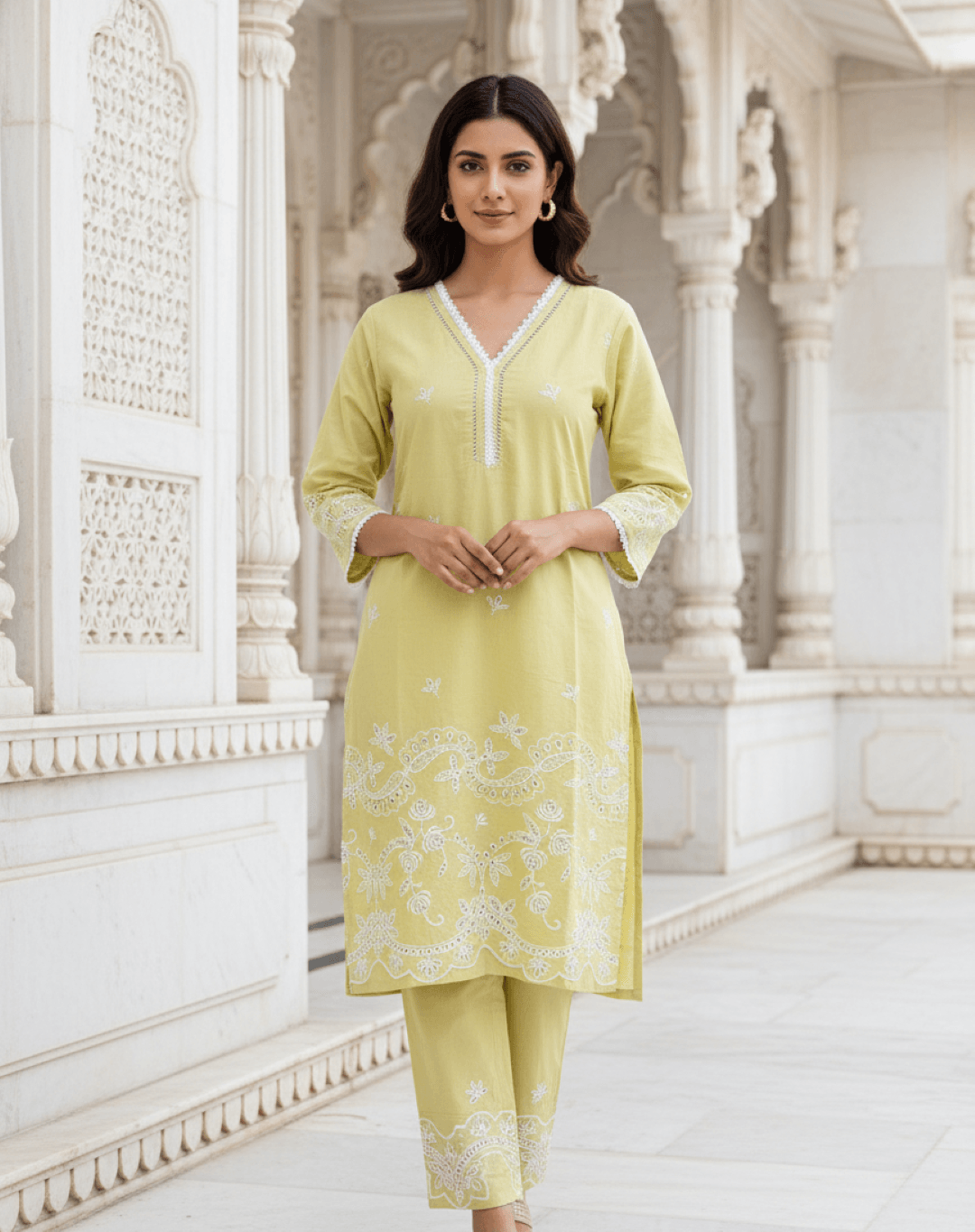 Top (Kurta): Straight-cut lemon yellow kurta with a V-neckline finished with lace detailing. Intricate white floral embroidery runs across the hemline, cuffs, and scattered motifs throughout for a delicate touch.