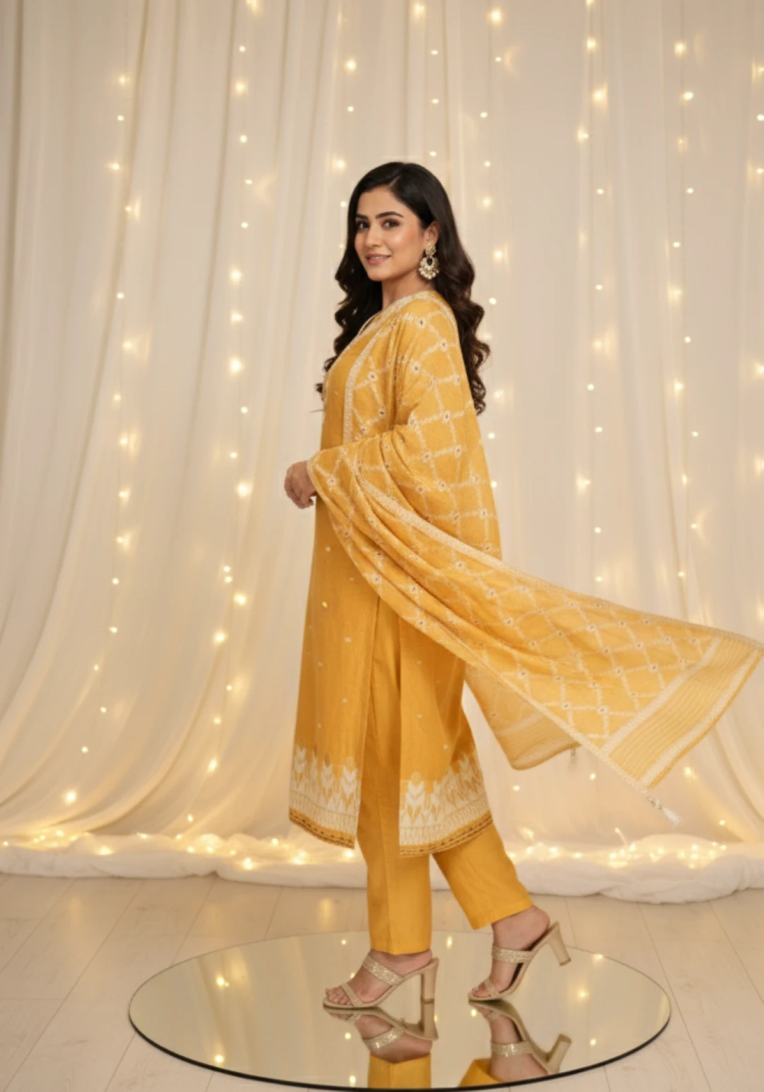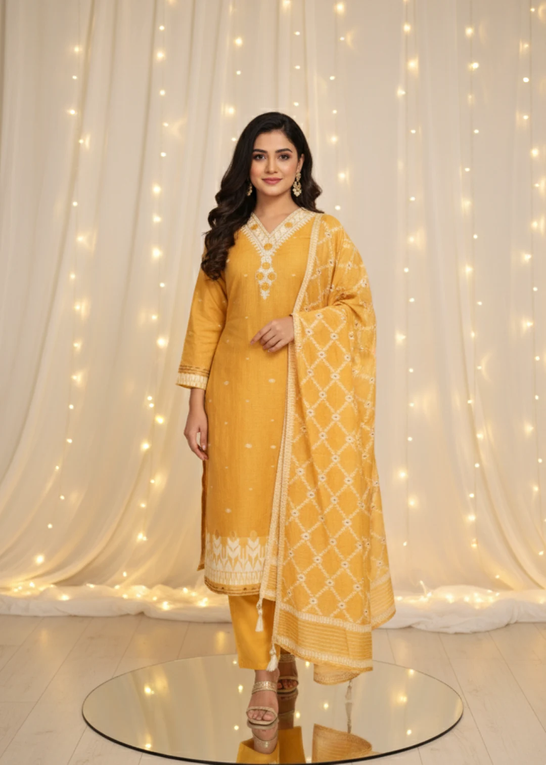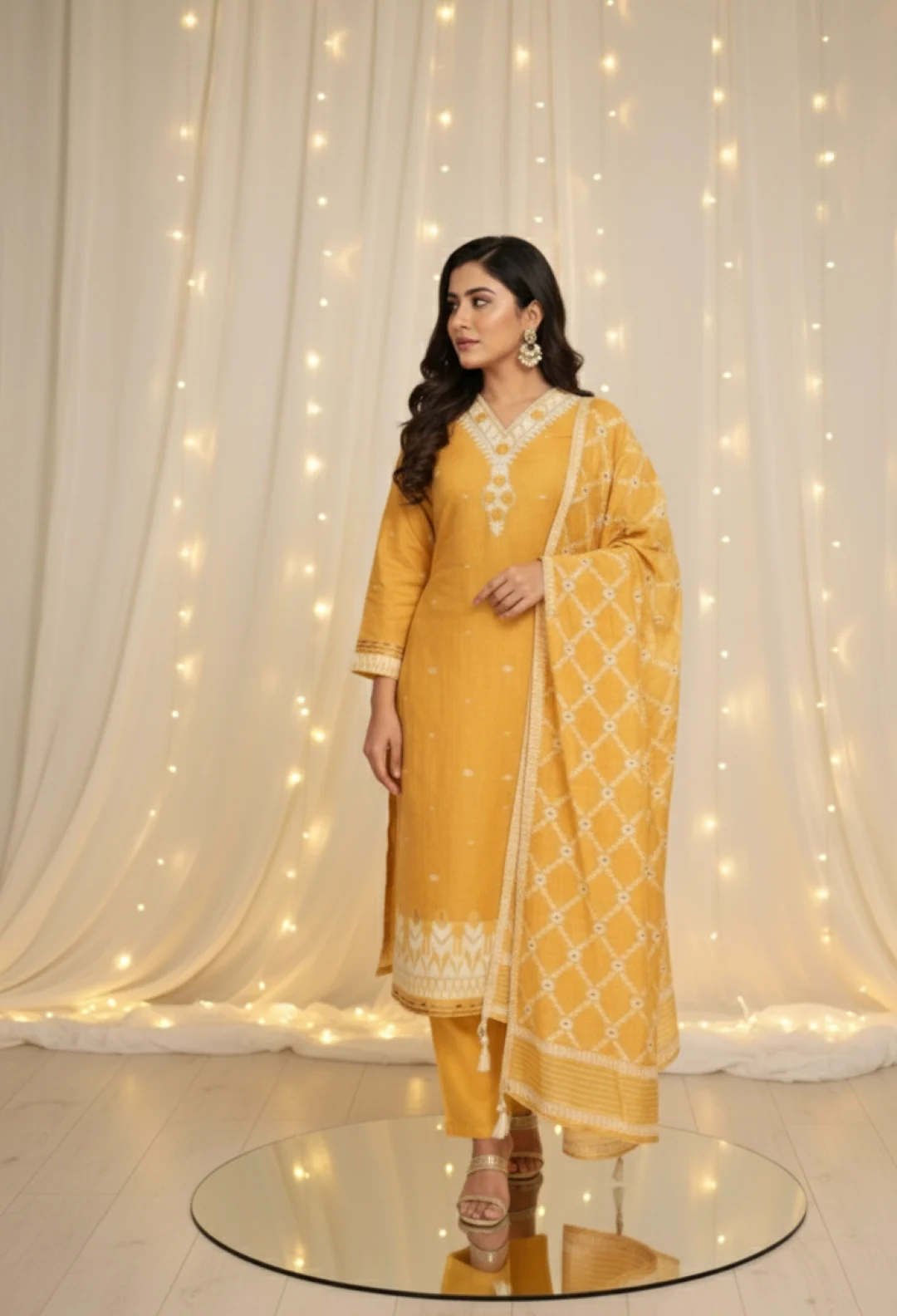 Top (Kurta): Straight-cut mustard yellow kurta with a V-neckline finished with delicate embroidery. White thread embroidery enhances the neckline, cuffs, and hemline with traditional motifs.