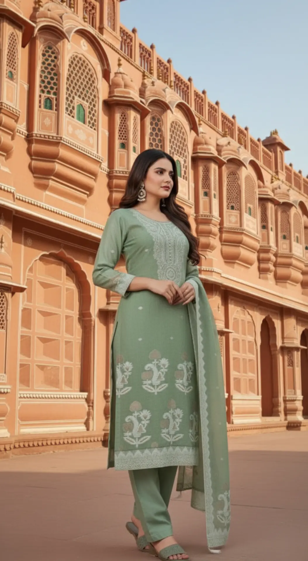 Bottom: Coordinated sage green slim-fit trousers in a plain finish to balance the embroidered kurta.