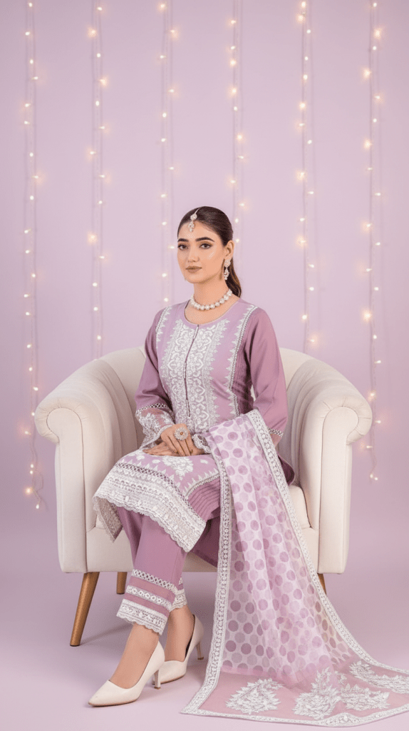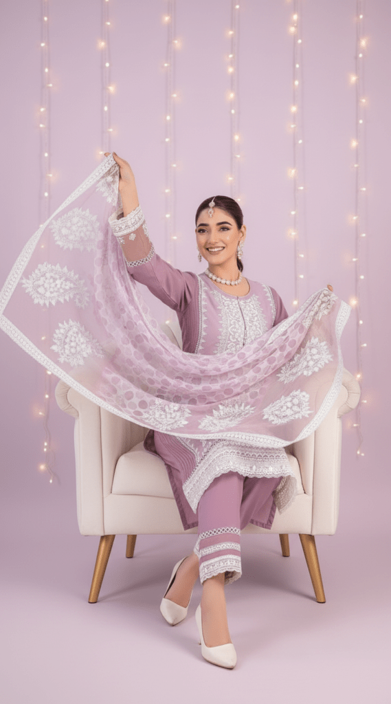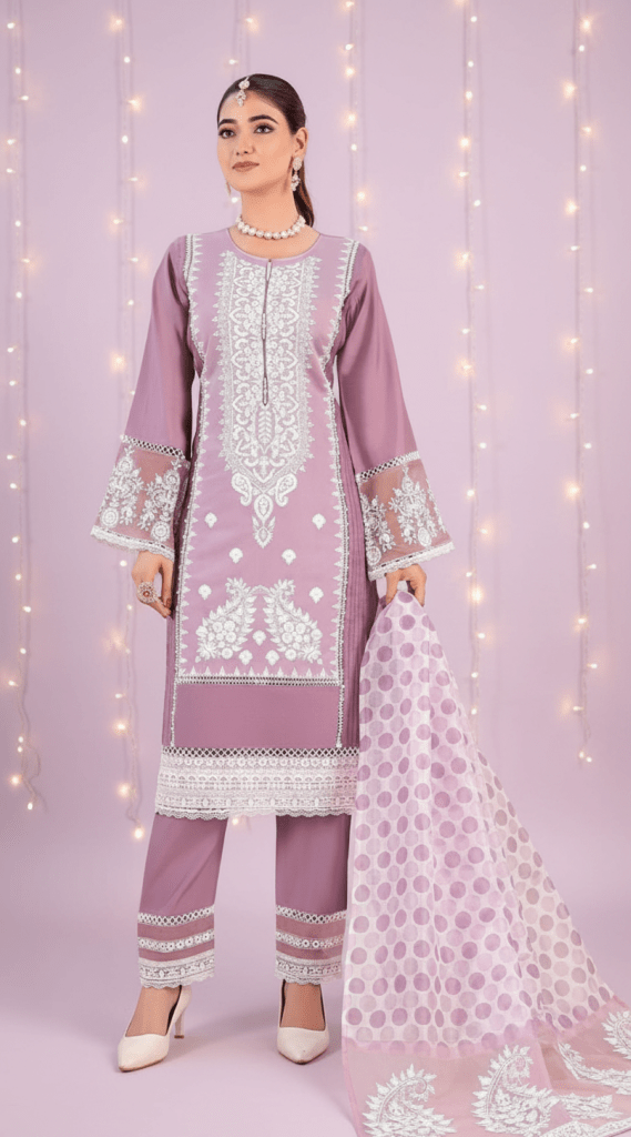 Top (Kurta): Straight-cut lavender kurta with a round neckline featuring a slit. Intricate white thread embroidery decorates the front panel, hem, and cuffs. Sheer organza inserts on the sleeves add a modern, delicate flair.
