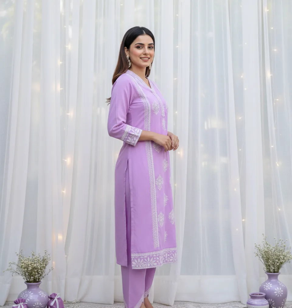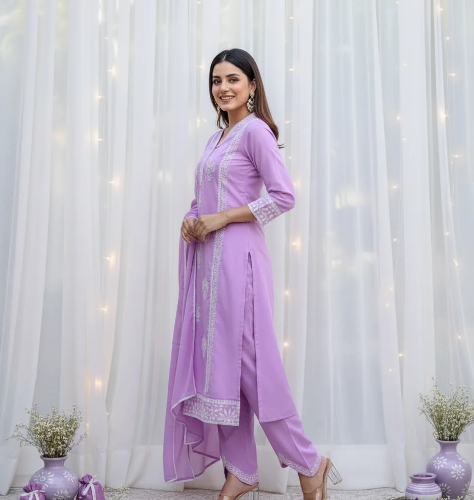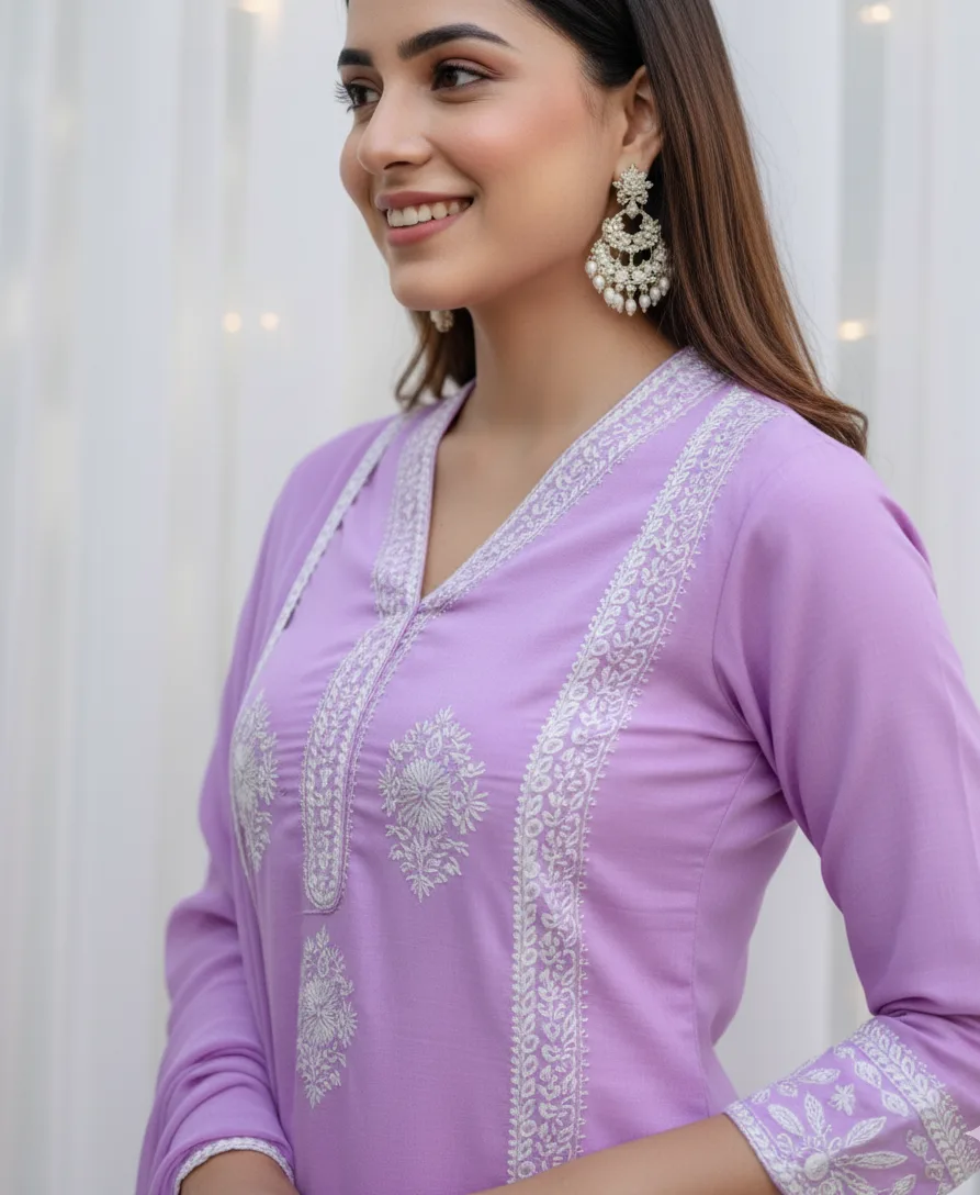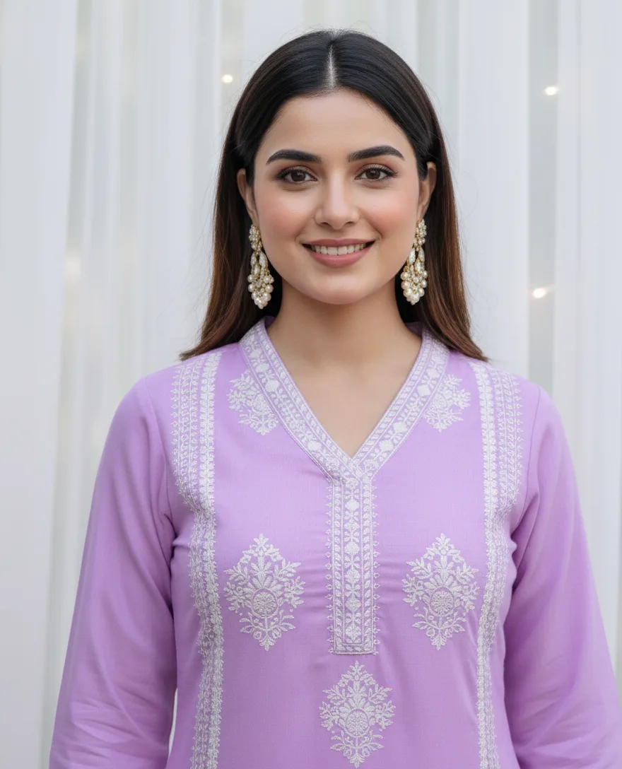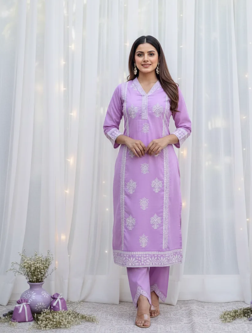 Dupatta: Flowing lilac cotton dupatta with embroidered edging, completing the coordinated look.