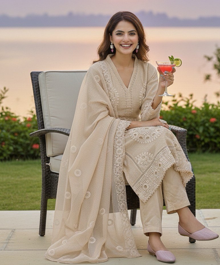 Dupatta: Matching beige dupatta with embroidered motifs and bordered edges, completing the elegant look.
