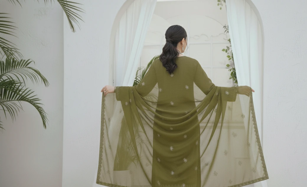 Style: Straight-cut Kurta with matching trousers and a flowy Dupatta.