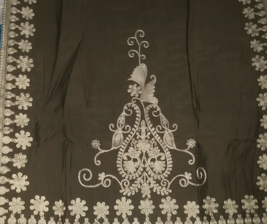 Work: Intricate Resham Embroidery on the neckline, hem, and scattered over the Dupatta.